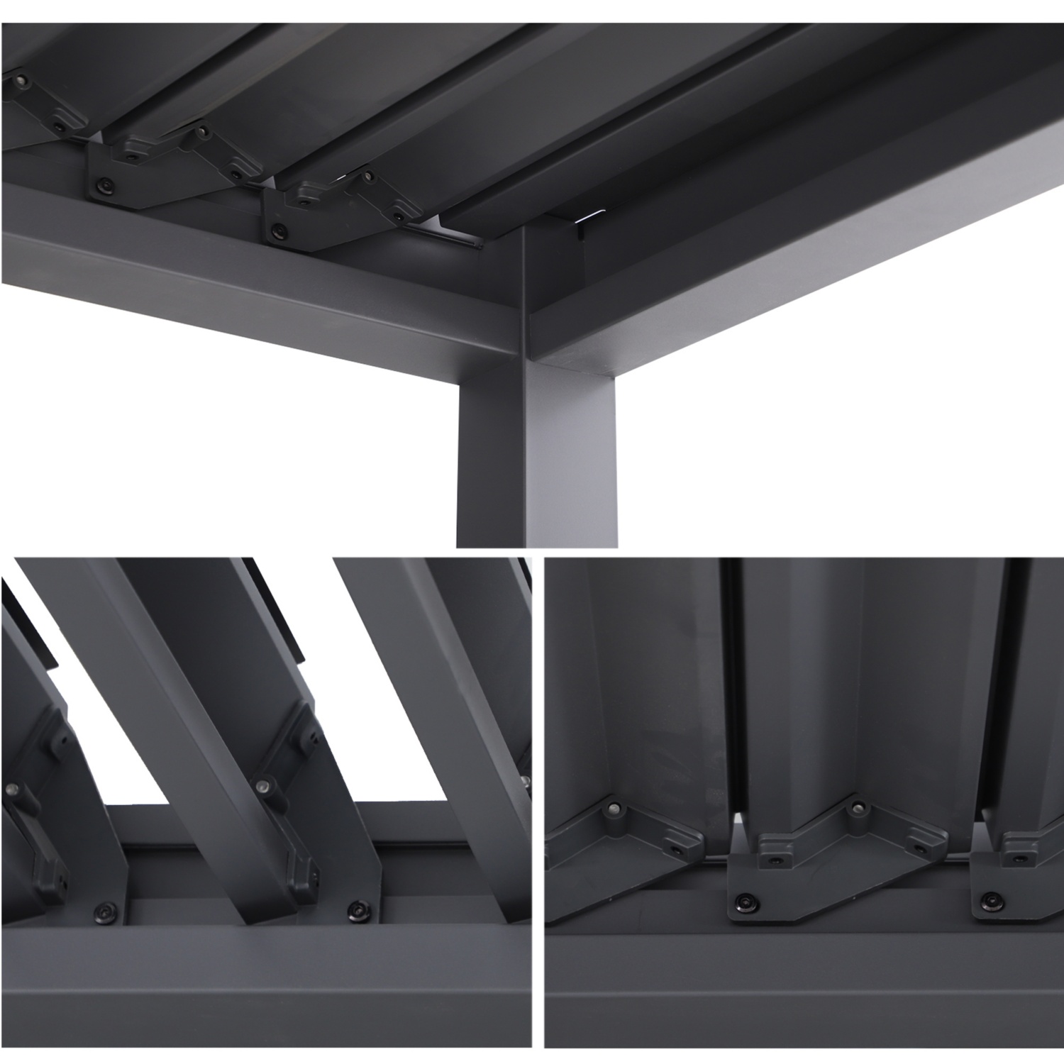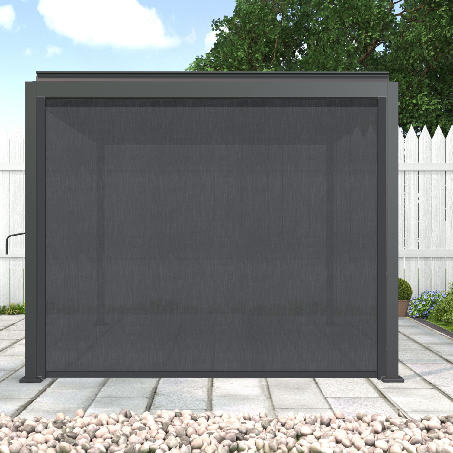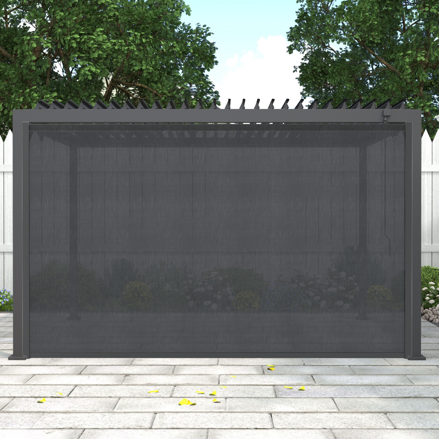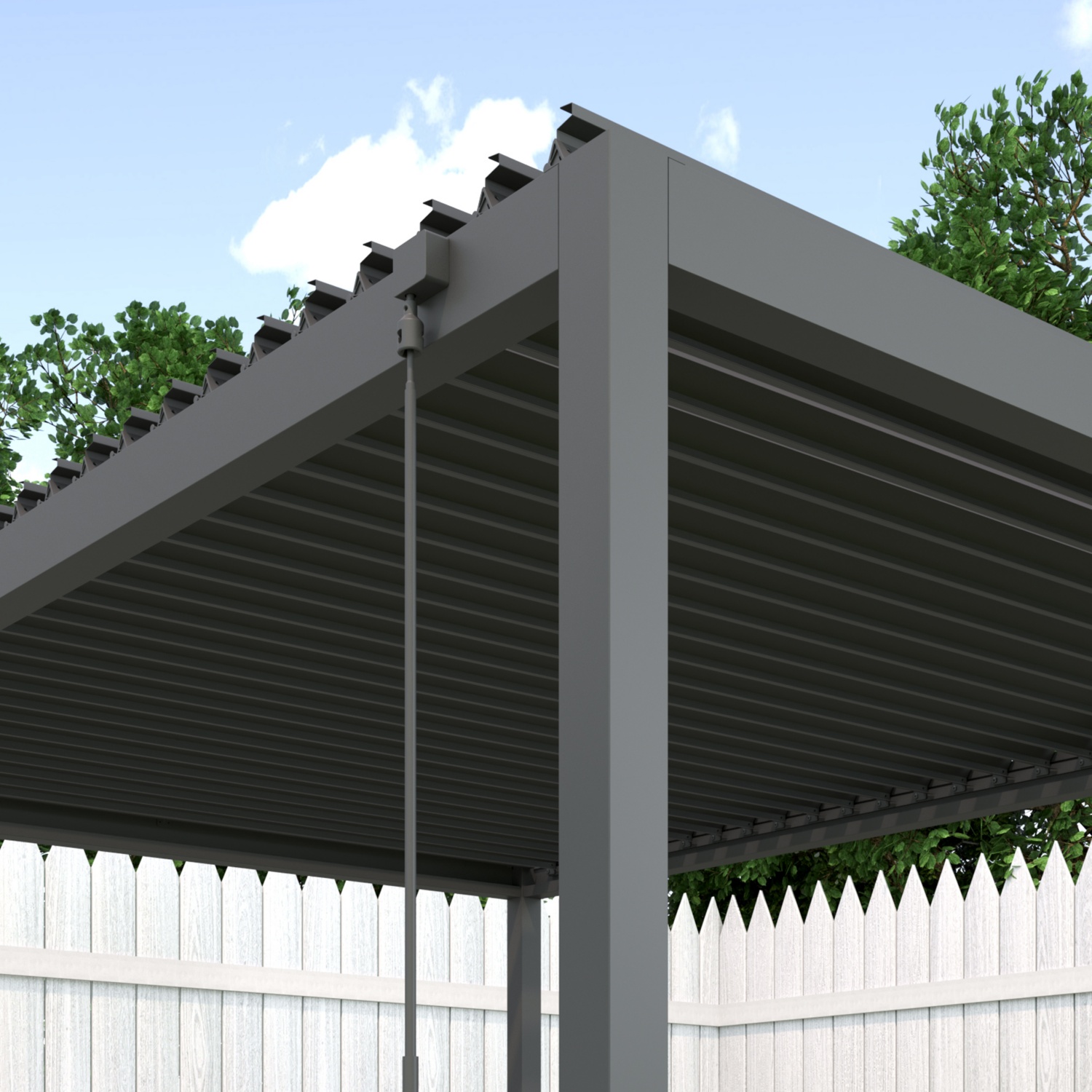 Intelligenter Komfort: Das elegante verstellbare Lamellendach ermöglicht eine mühelose Kontrolle von Sonnenlicht und Luftzirkulation.