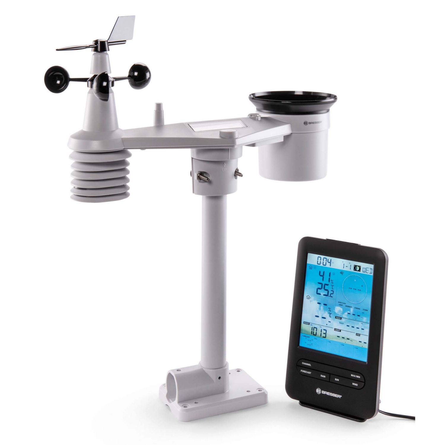 • misst Temperatur und Luftfeuchtigkeit (innen/außen), Windgeschwindigkeit/-richtung, Niederschlagsmenge, UV-Level, Lichtintensität, Luftdruck