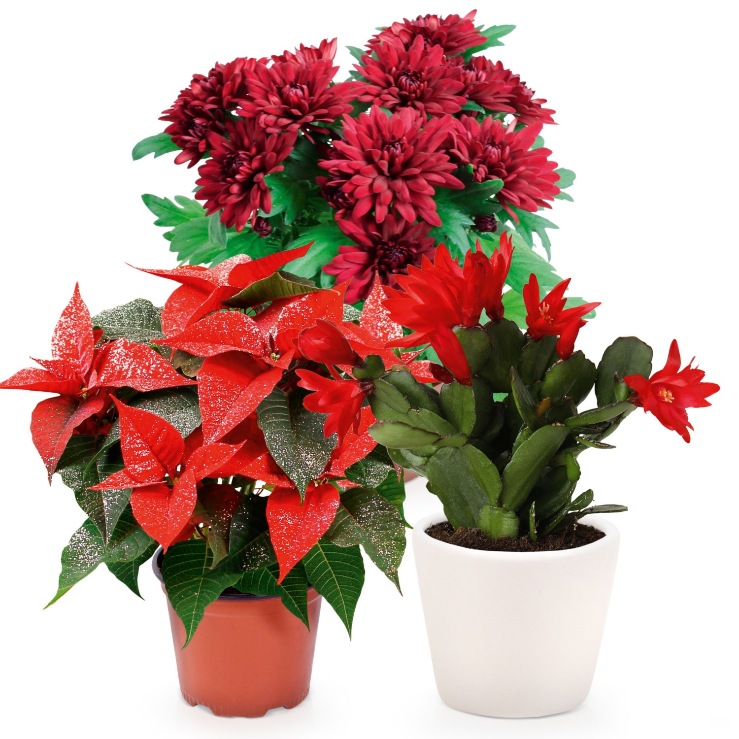 im 6-, 10,5- bzw. 12-cm-Topf, Höhe inkl. Topf: 10 - 25 cm (je nach Sorte), verschiedene Blühpflanzen wie Weihnachtsstern, Weihnachtskaktus und Chrysantheme, teilweise mit Keramik bzw. Glitter