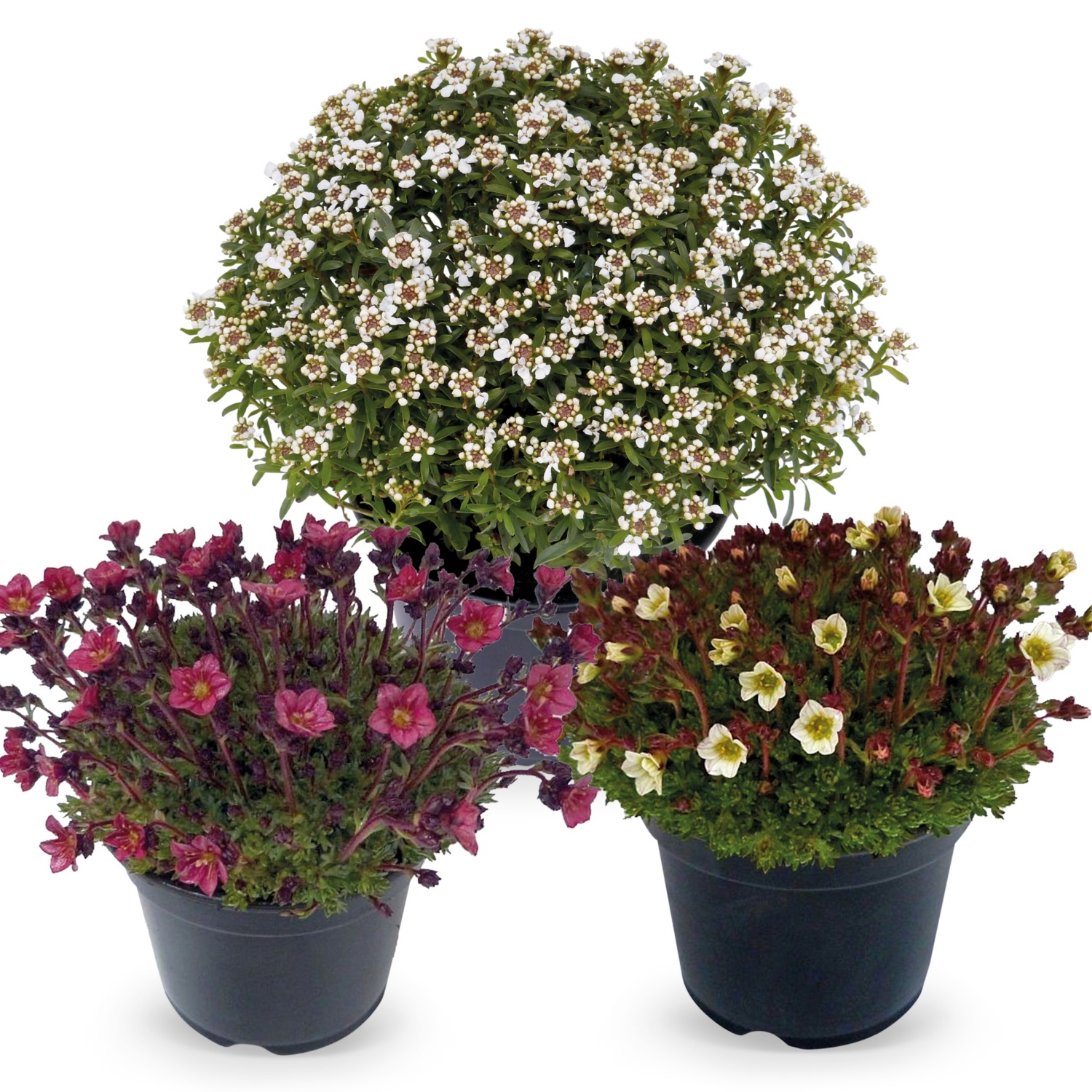 im 13-cm-Topf, Höhe inkl. Topf: 15 - 25 cm, verschiedene Sorten wie Berg-Sandkraut, Blaukissen, Heide-Nelke etc.