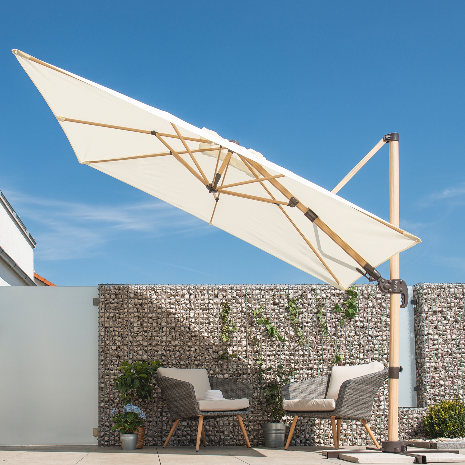 • verstellbares und 360° schwenkbares Schirmdach