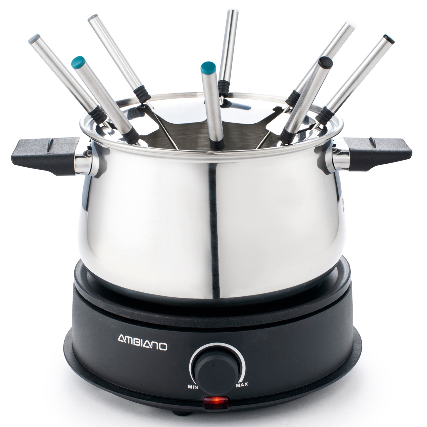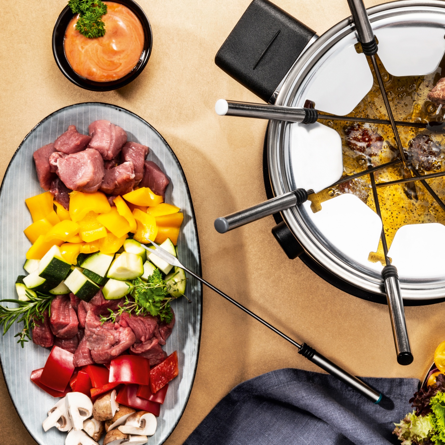 • inkl. 8 farblich markierten Edelstahl-Fondue-Gabeln und Spritzschutz/Gabelhalter