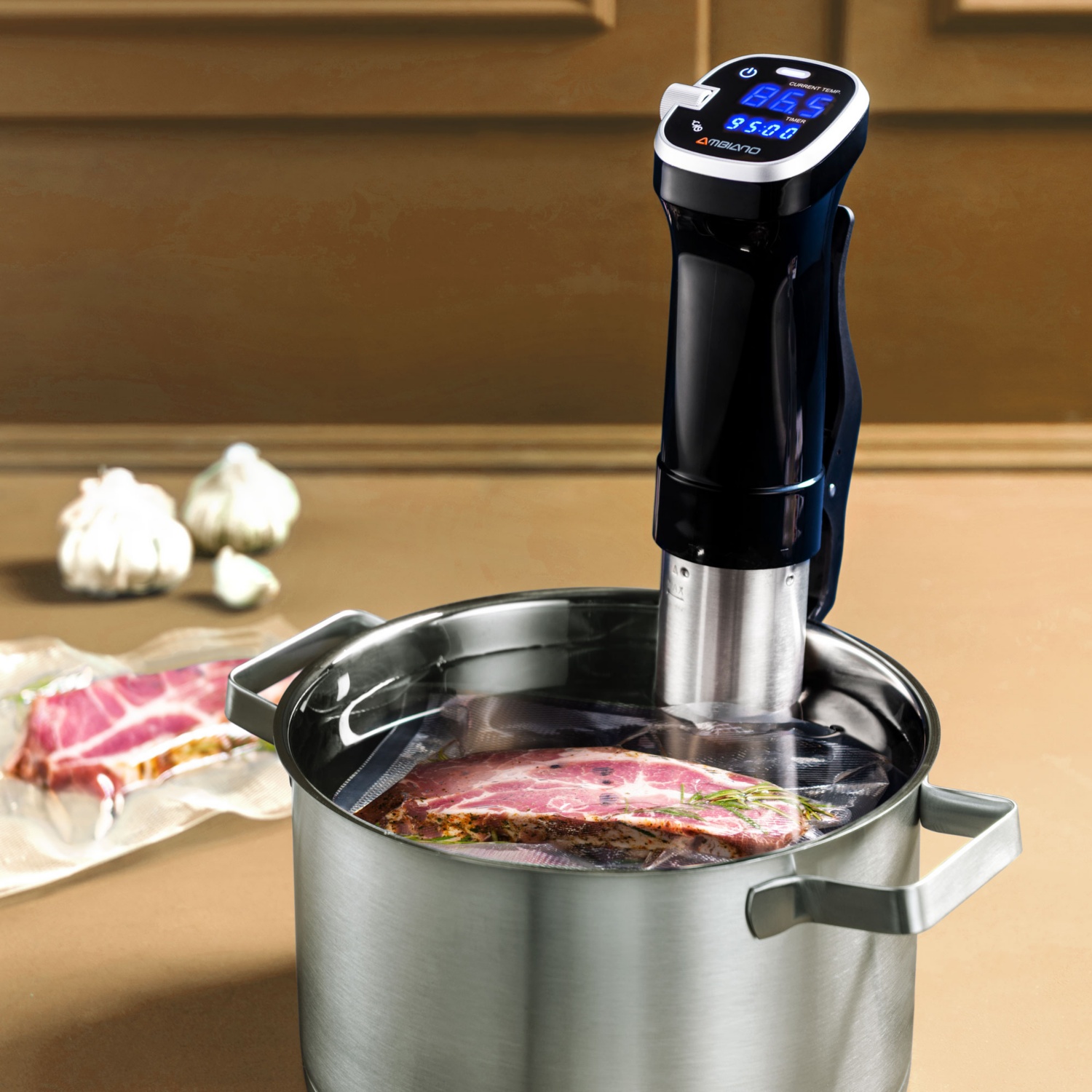 Funktionsweise: Der Stick wird in einen mit Wasser befüllten Topf gestellt und mit dem Clip am Topfrand befestigt. Nachdem das eingeschweißte Gargut mitsamt der Folie ins Wasser gelegt wurde, können die Temperatur sowie der Timer am Stick individuell programmiert werden. Es ist kein Erhitzen des Wassers durch einen Herd notwendig, der Stick erwärmt das Wasser selbstständig und wird durch ein Netzkabel mit Strom versorgt. Wichtig für den Erfolg des Sous-Vide-Garens ist eine sehr konstante Temperatur, welche durch eine Umwälzpumpe im Stick garantiert wird. Die Abschaltautomatik schützt zudem bei zu niedrigem Wasserstand vor An- bzw. Verbrennen des Garguts. Begriffserklärung "Sous-Vide": Als Sous-Vide-Garen bezeichnet man eine Methode zum langsamen Garen von in Vakuum-Folie eingeschweißtem Fleisch, Fisch und Gemüse bei relativ niedrigen Temperaturen (max. 90 °C). Vorteil: Weder flüchtige Geschmacksstoffe oder Aromen noch Wasser können bei dieser Methode entweichen, daher bleibt das Gargut besonders aromatisch und saftig. Bitte beachten Sie, dass diese Aktionsartikel, im Unterschied zu unserem dauerhaft erhältlichen Sortiment, nur in begrenzter Anzahl zur Verfügung stehen. Abgabe nur in Haushaltsmengen und solange der Vorrat reicht. Sollten bestimmte Produkte, trotz sorgfältiger Planung, aufgrund unerwartet hoher Nachfrage, am ersten Aktionstag ausverkauft sein, bitten wir um Verständnis. Bei Textilien und Schuhen sind teilweise Modelle nicht in allen Größen erhältlich. Beim Kauf eines Elektro-/Elektronikartikels können Sie Zug um Zug ein Gerät gleichwertiger Art unentgeltlich in unserer Filiale zurückgeben. Kein Flaschenpfand, inkl. sämtlicher Steuern. Alle Artikel ohne Dekoration. Die Abbildungen verstehen sich als Serviervorschläge bzw. Symbolfotos. Bei Preissenkungen ist die Angabe der %-Senkung kaufmännisch gerundet. Wir führen unterschiedliche Verpackungen. In unseren Filialen wird jeweils nur eine Verpackungsart angeboten. Bitte beachten Sie, dass vereinzelte Filialen ein abweichendes Sortiments- und Aktionsartikelangebot führen. Diese sind aufhofer.at/filialenzu finden sowie vor Ort entsprechend gekennzeichnet. Technische und optische Änderungen sowie Satz- und Druckfehler vorbehalten.
