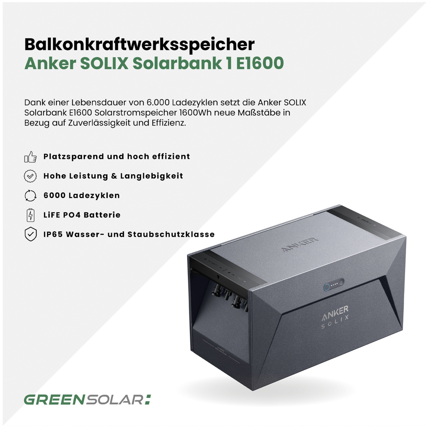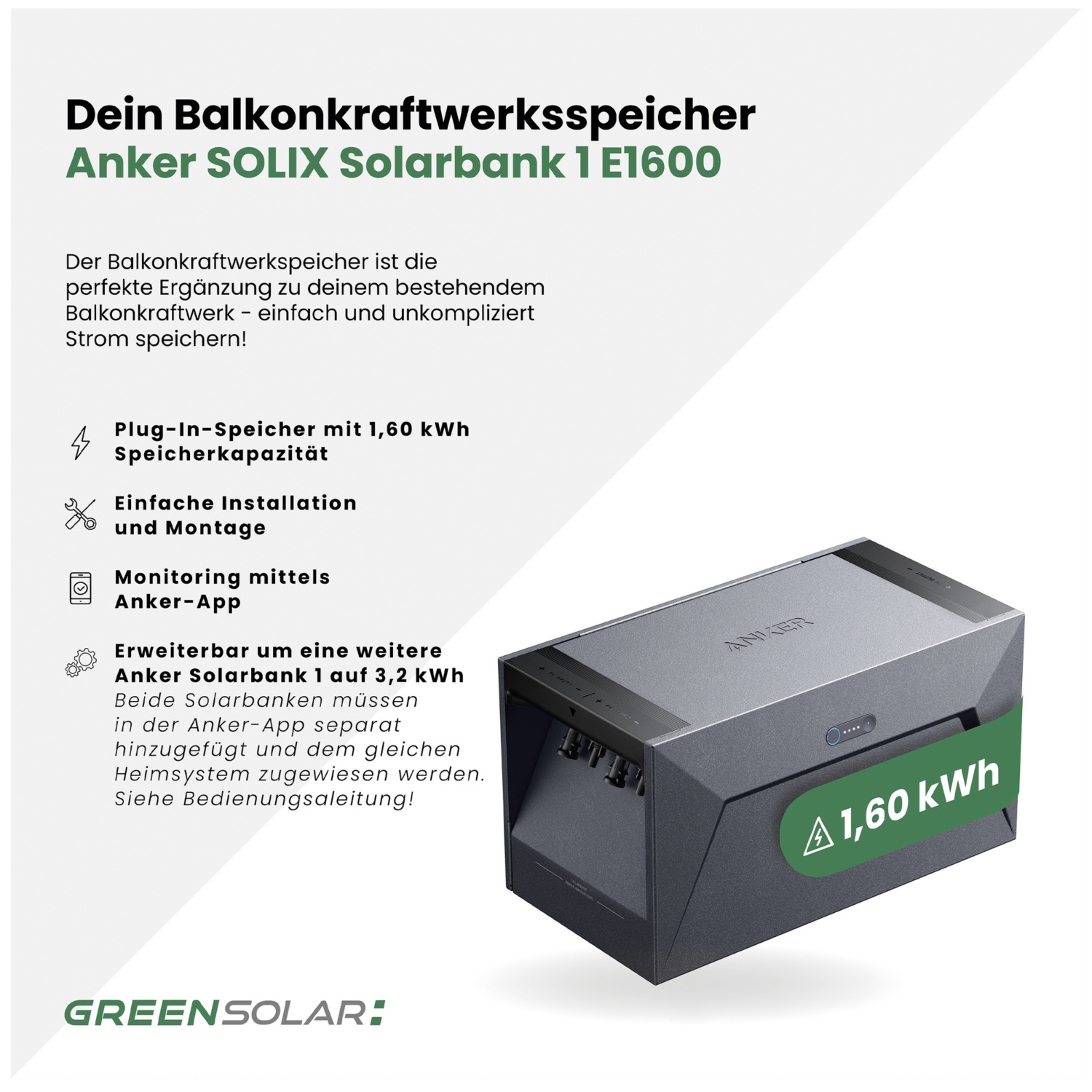 Die Green Solar Anker SOLIX Solarbank 1 E1600ist die perfekteEinsteiger-Batteriefür alle, die ihr bestehendes Balkonkraftwerk unkompliziert um einen Speicher erweitern möchten. Mit1,6 kWh Kapazitätspeichert sie überschüssigen Solarstrom, den du später – etwa abends oder bei schlechtem Wetter – nutzen kannst. Die Installation ist kinderleicht: einfach zwischen Solarmodul und Wechselrichter anschließen. Ein Wechselrichter ist erforderlich und separat erhältlich.
