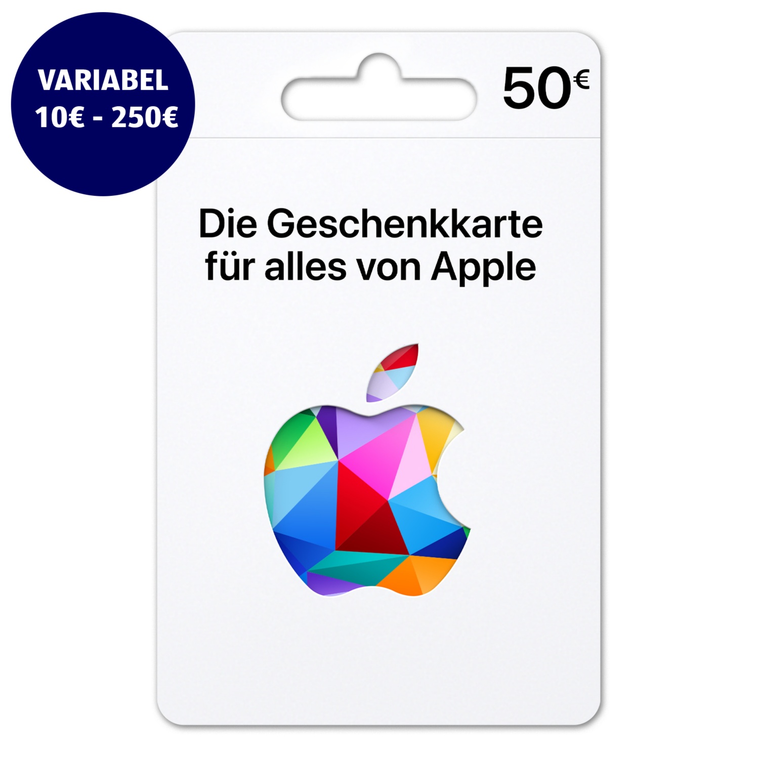 Die APPLE-Gutscheinkarte ist sowohl als Fixbetrag mit 25€ und 50€ als auch mit einem variablen Betrag zwischen 10€ und 250€ zu erwerben.