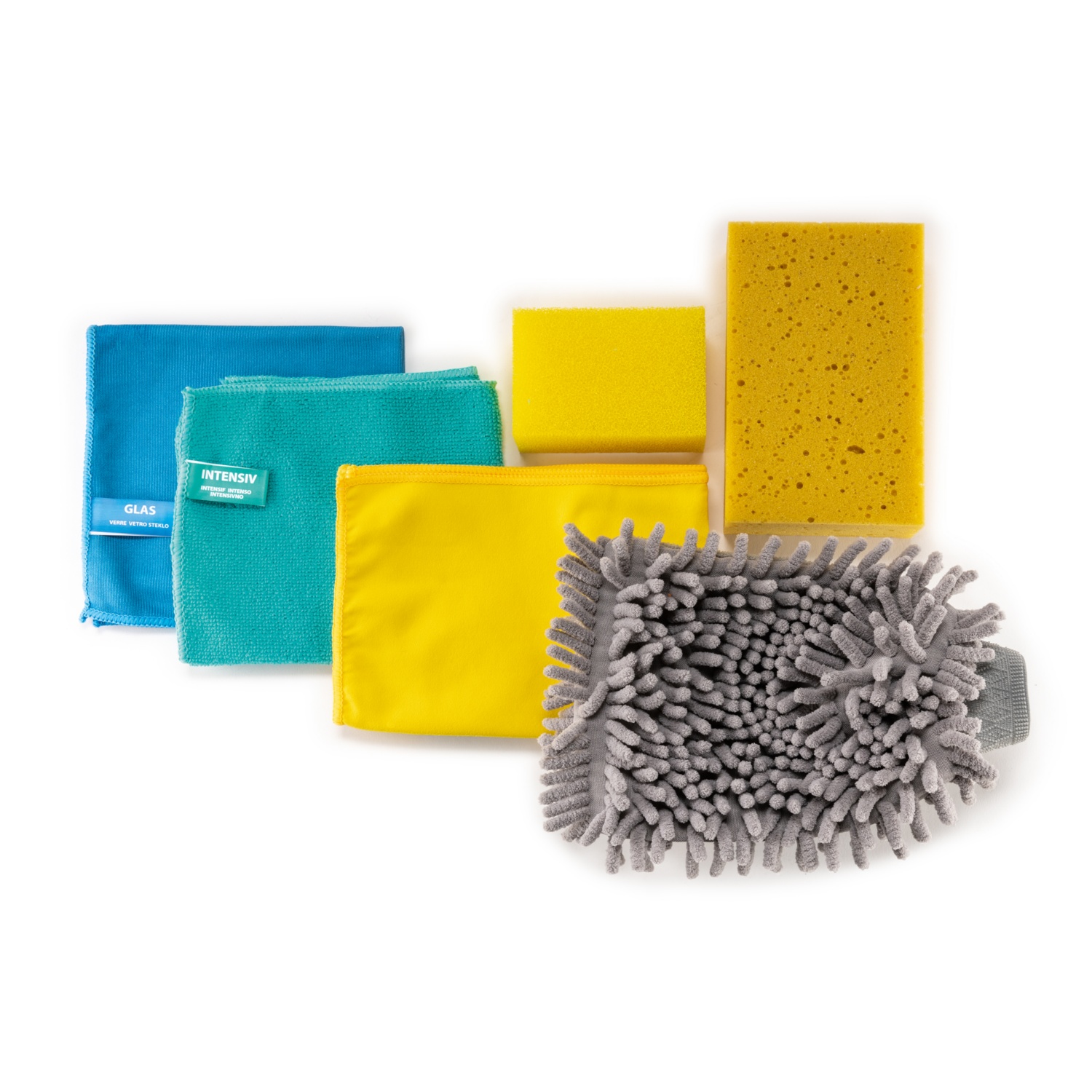 verschiedene Mikrofasertücher, Schwämme und ein Handschuh zur Pflege des Autos