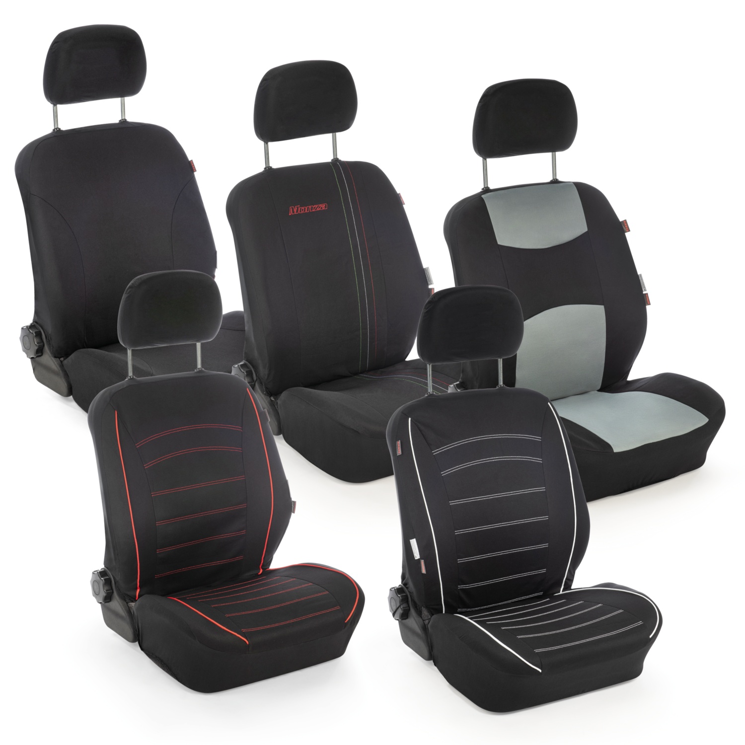 • Komplett-Garnitur: für 2 Vordersitze (2-teilig), 5 Nackenstützen und einen Rückbankbezug (teilbar)
