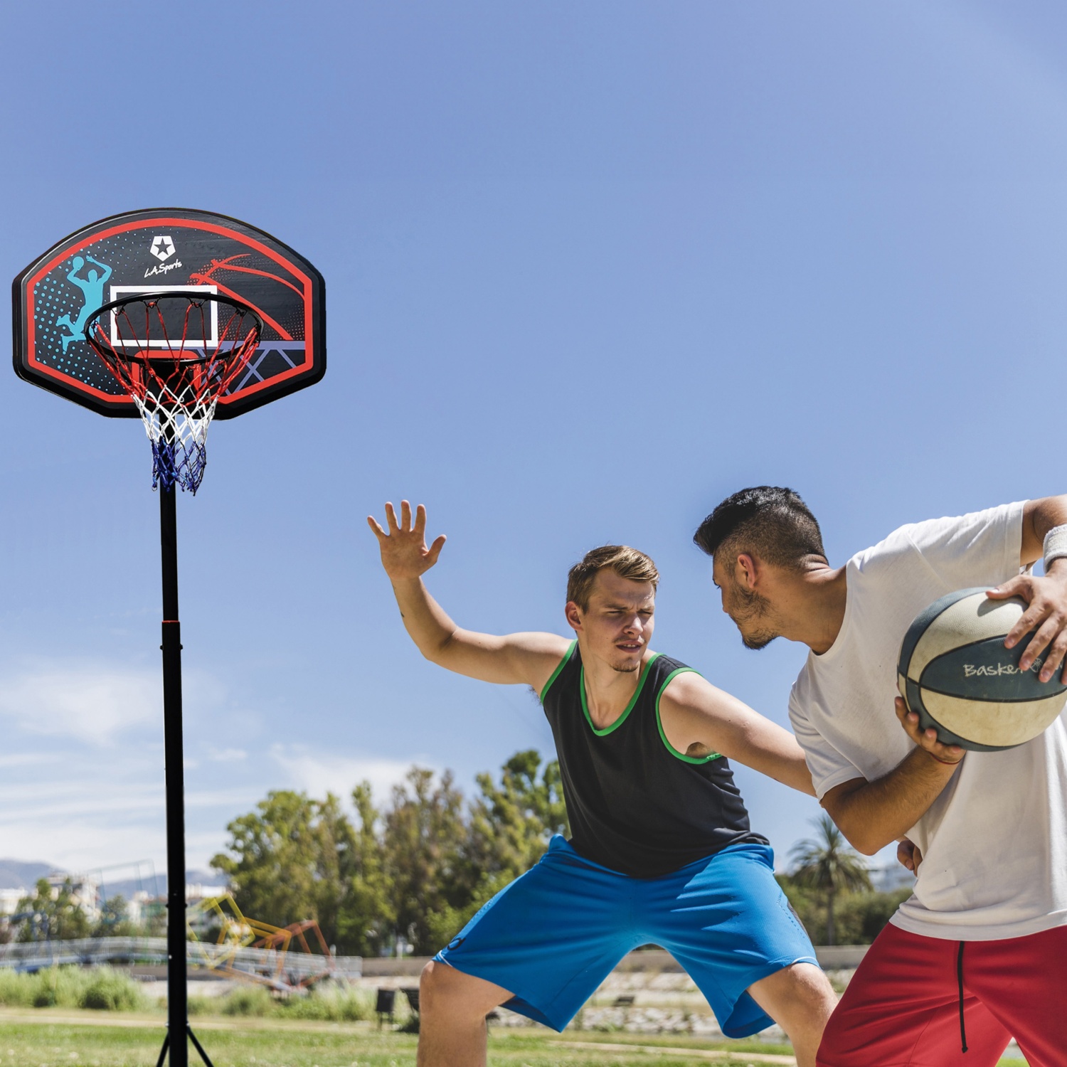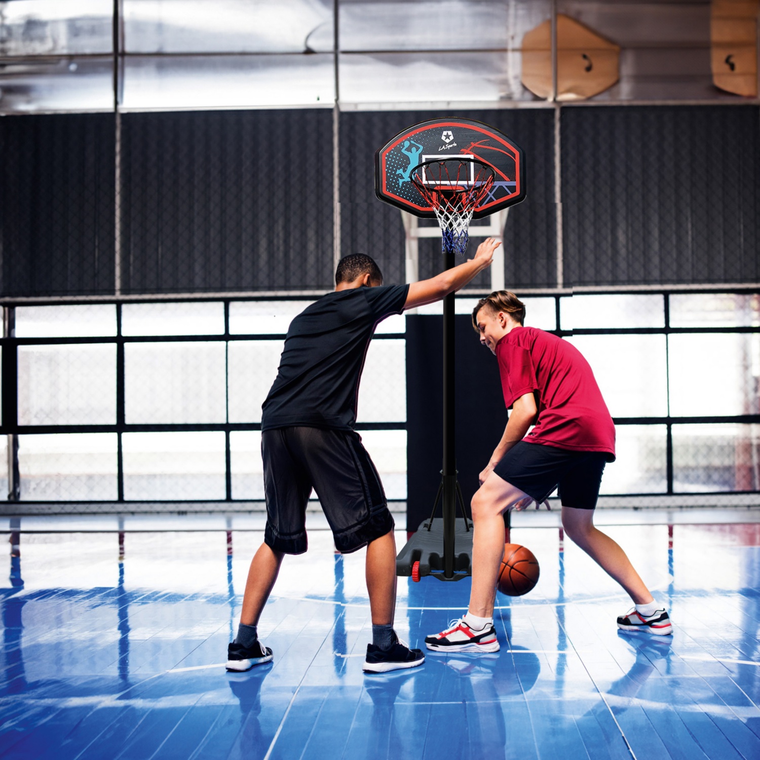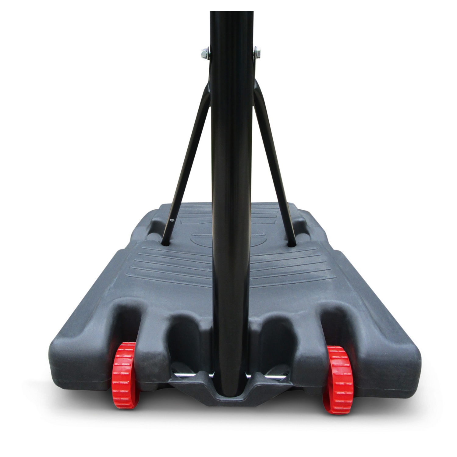 • Der transportable Basketballständer ist ideal für den Einsatz in Haus und Garten. Durch die Räder ist der Basketballständer leicht zu transportieren. Für einen sicheren Stand lässt sich der Ständer mit Wasser oder Sand befüllen. Dank der Höhenverstellung von ca. 205 bis 260 cm Ringhöhe (Gesamthöhe ca. 260 - 310 cm), wächst der Basketballkorb mit, so ist ein langer Spielspaß für Kinder, Jugendliche und Erwachsene garantiert. Die stabilen Metallrohre sind pulverbeschichtet. Das Basketballbrett ist aus robustem Kunststoff (PE) gearbeitet und hat eine Größe von ca. 91 x 57 und ist ca. 3 cm stark. Der Ring hat einen Durchmesser von ca. 47 cm und das Netz ist 46 cm lang. Passend für Mini und Standard Basketbälle. Details: