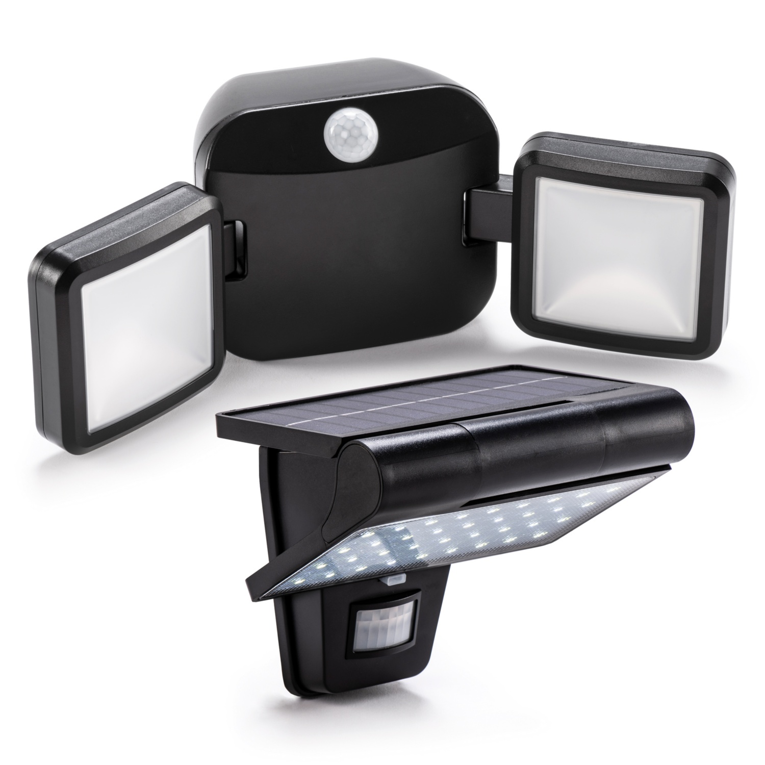 • LED-Außenstrahler Batterie: Reichweite des Bewegungsmelders 6 m, 2 x 5 W, 2 x 300 lm, 4.000 K, nicht dimmbar, inkl. Batterien, IP54 staub- und spritzwassergeschützt, Maße: 112 x 332 x 105 mm oder