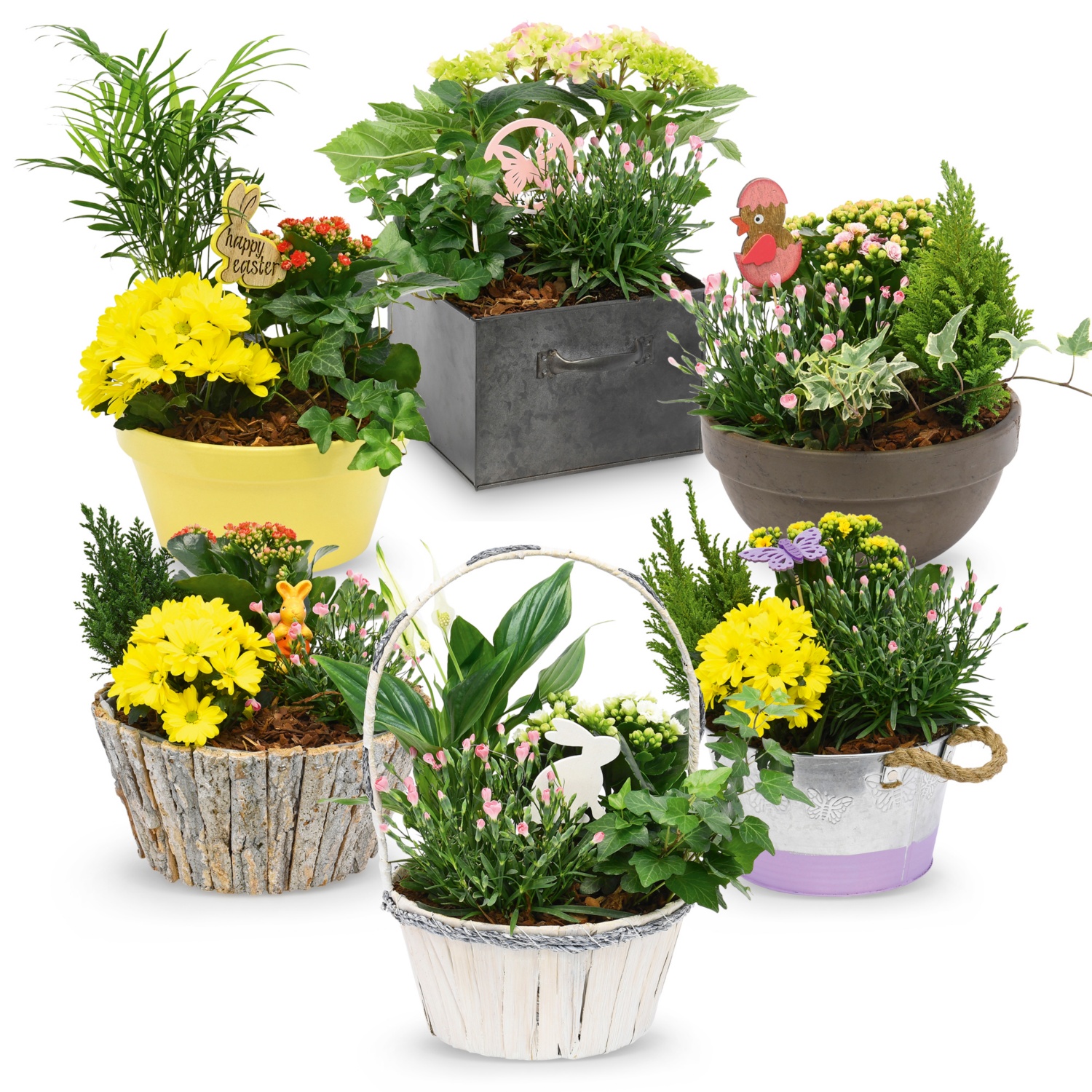 Ø Gefäße: 20-30 cm (je nach Gefäß), verschiedene Gefäße hochwertig bepflanzt mit verschiedenen Frühlingsblühern, inklusive Dekostecker