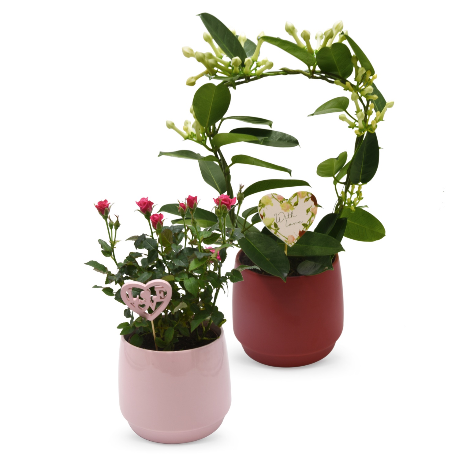 im hochwertigen 15-cm-Keramiktopf, verschiedene Sorten wie Topfrose, Calla, Kranzschlinge oder Flamingoblume, inklusive Dekostecker