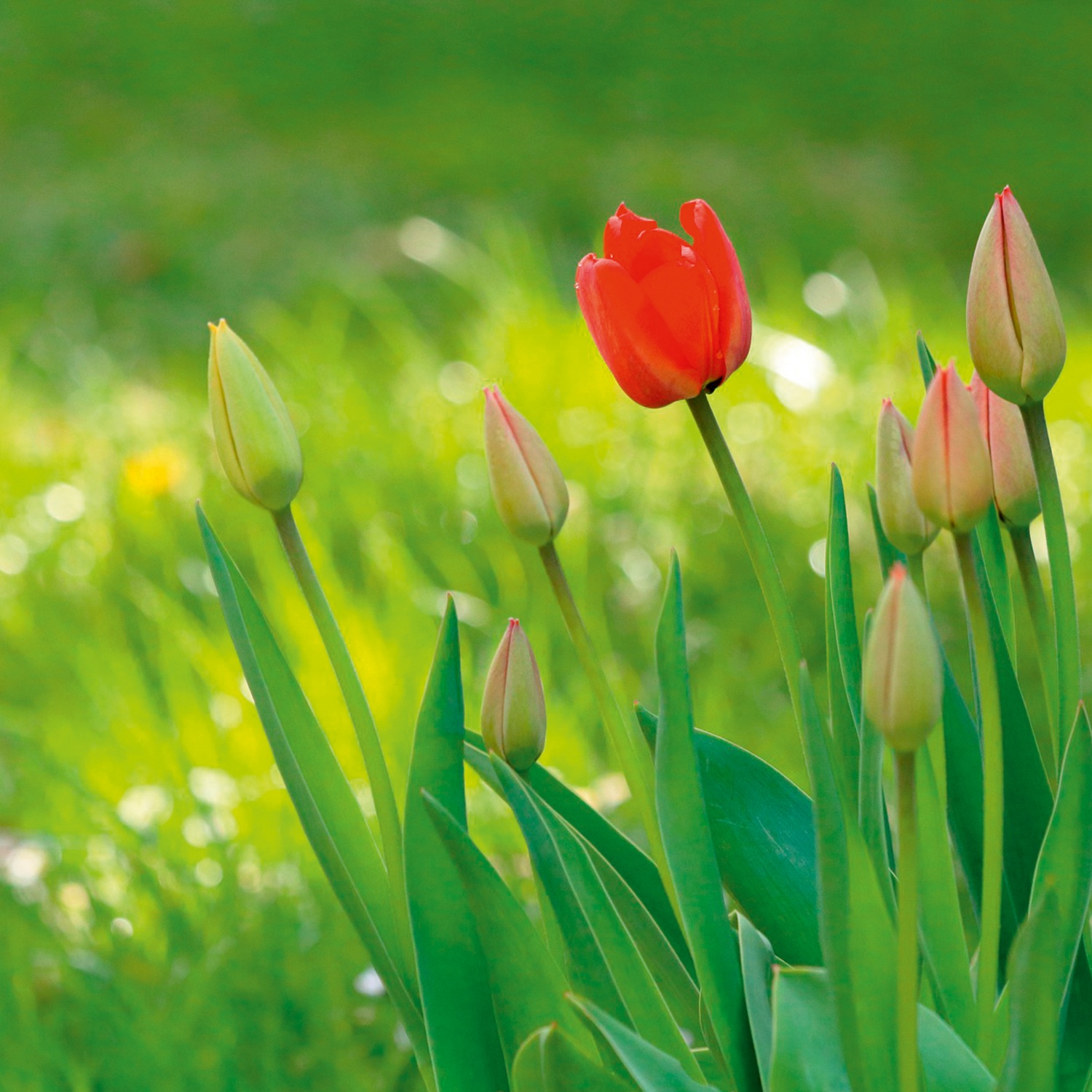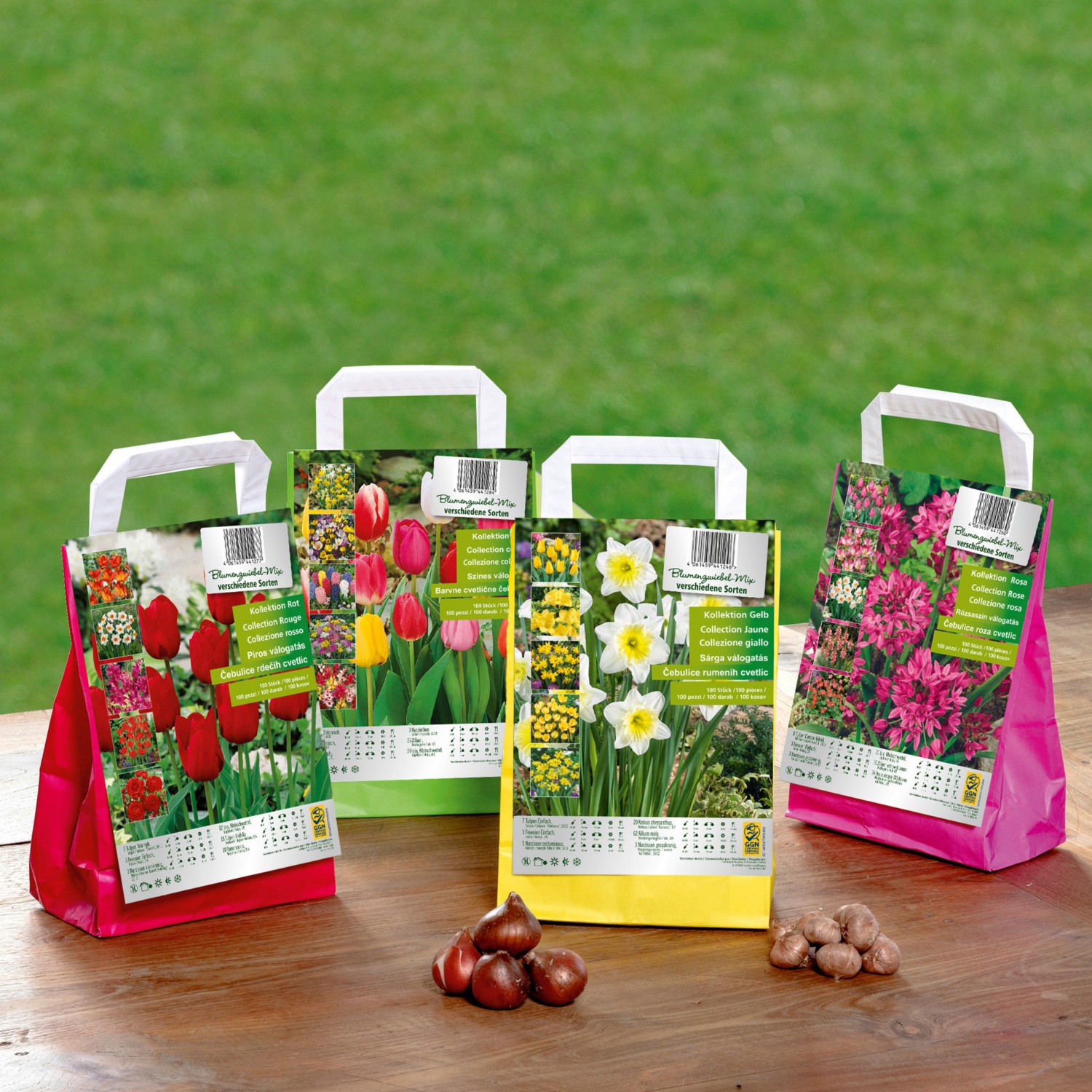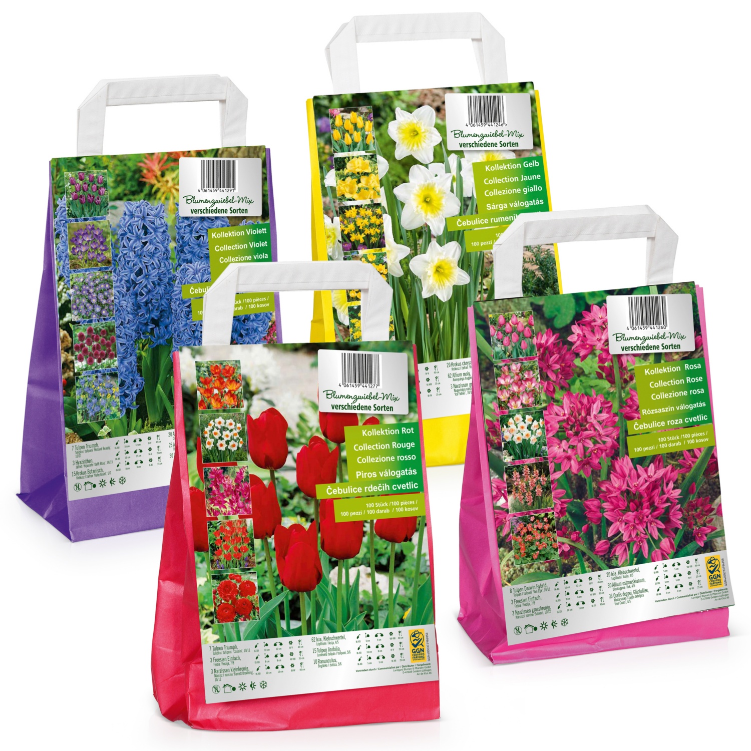 100 Zwiebeln je Packung, verschiedene Sorten in der recyclingfähigen Papiertragetasche, in den Farben Gelb, Rosa, Rot, Purpur, Weiß oder Bunt