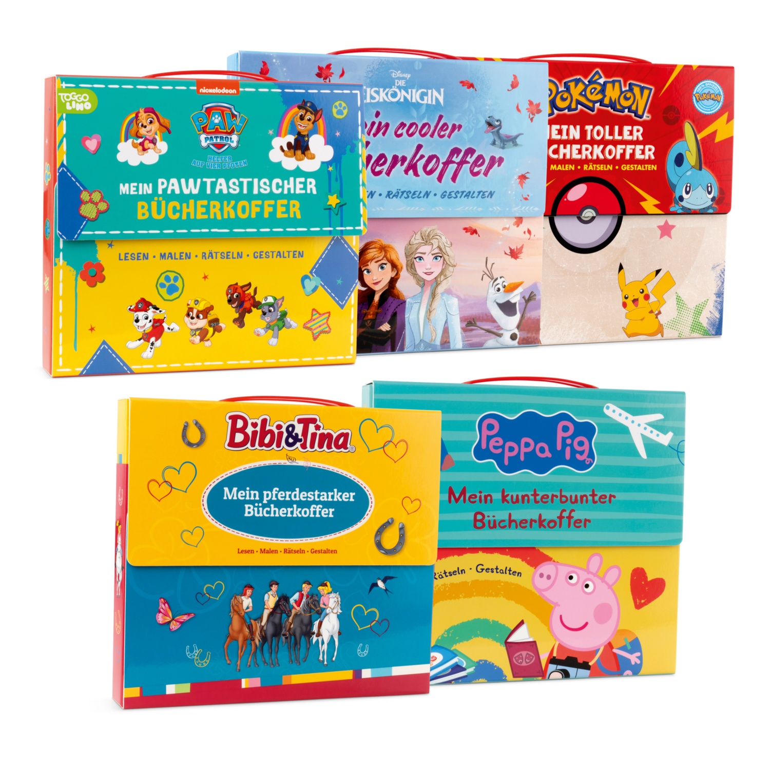 Ein praktisches Buch-Set mit zwei Geschichtenheften, einem Malblock, einem Rätselblock und einem Poster zum mitnehmen.