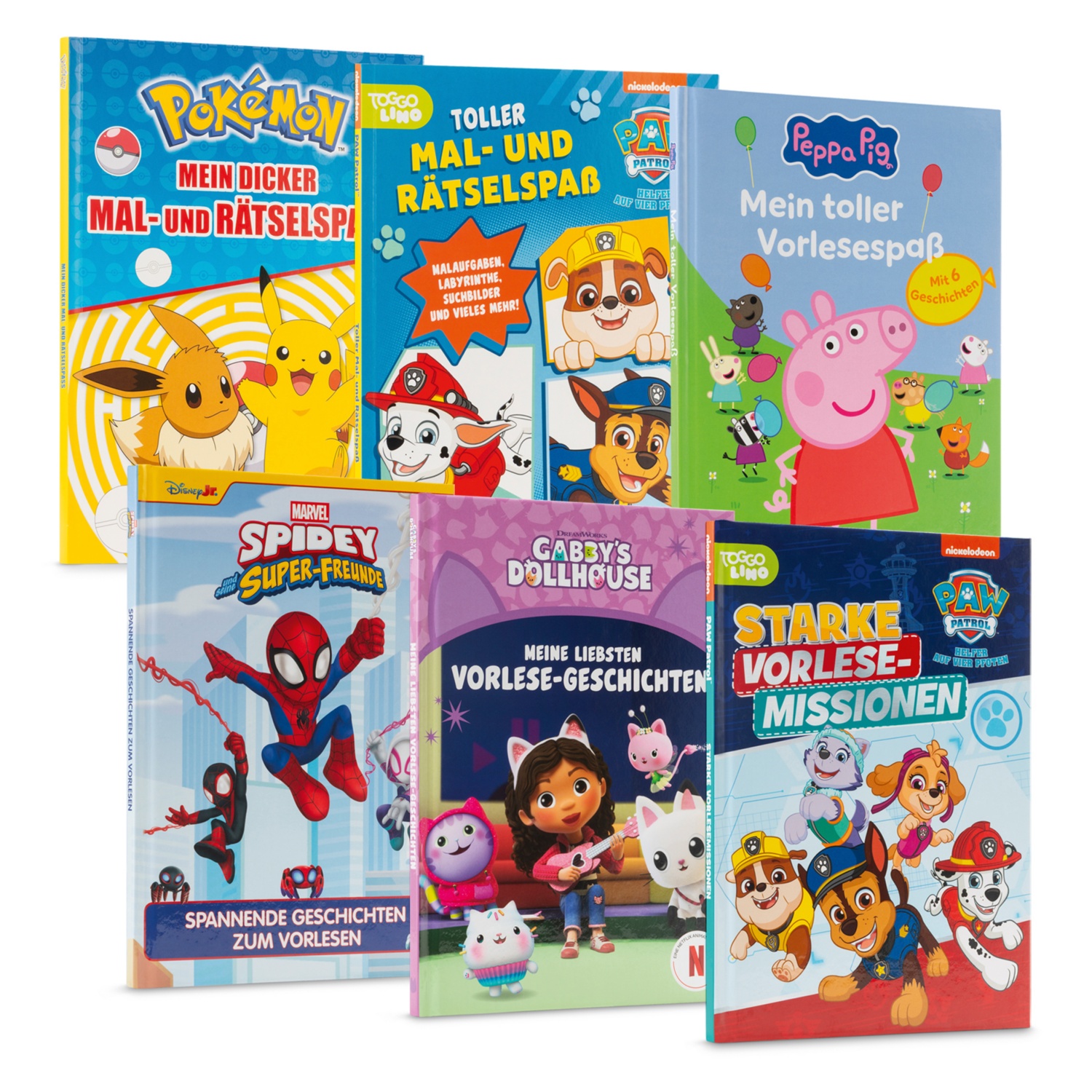 Geschichtenbücher und Beschäftigungsbücher von PAW Patrol, Peppa Pig, Pokémon, MARVEL Spidey und Gabby's Dollhouse, verschiedene Titel