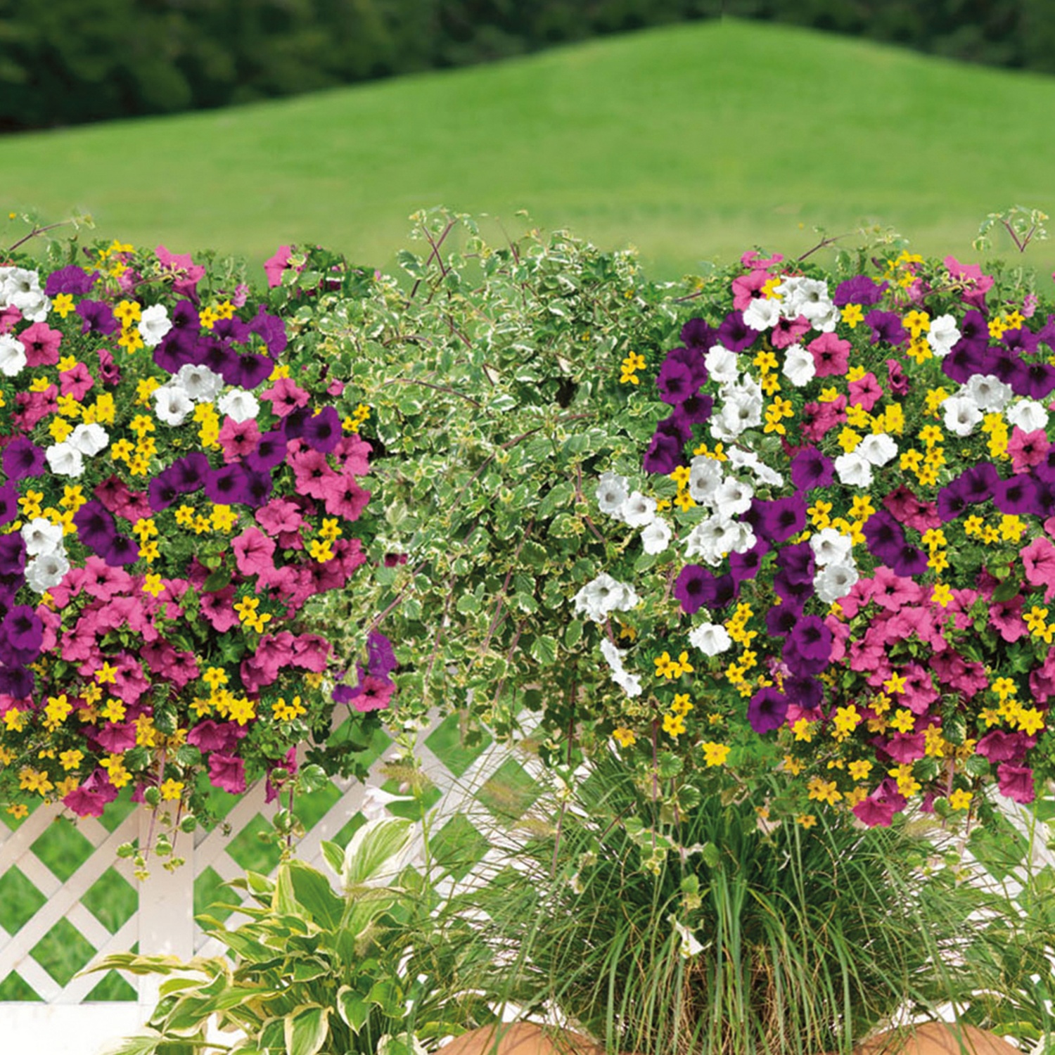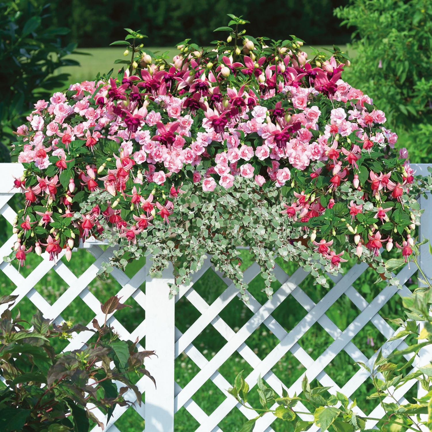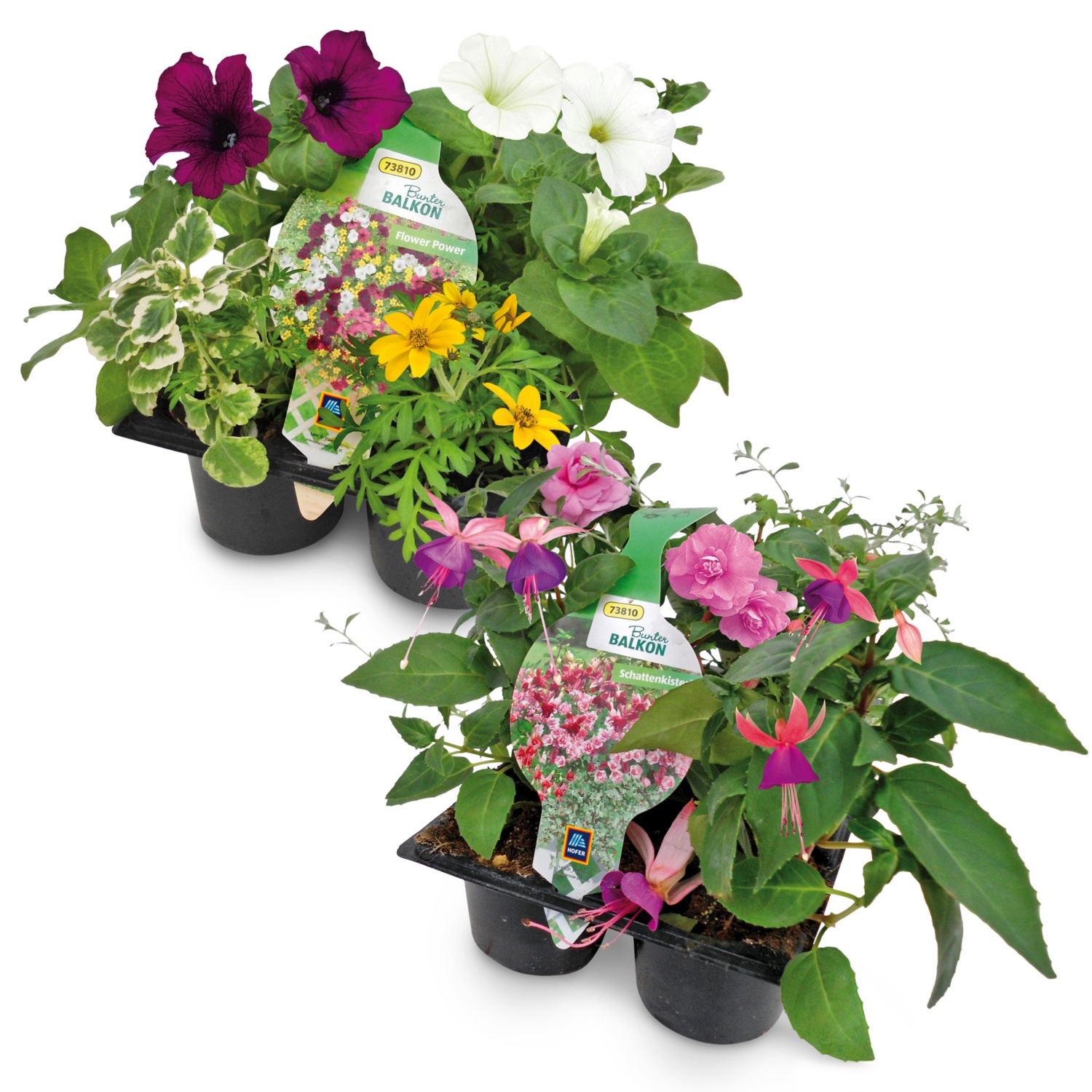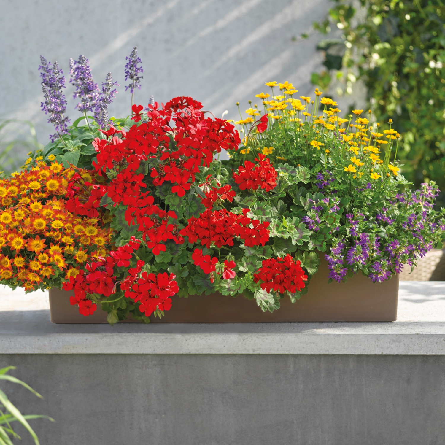 diverse Kombinationen aus 5 Balkonblumen, Sorten aufeinander abgestimmt, z. B. "Bienenkisterl" bestehend aus Salbei, Pelargonie rot, Goldmarie "BeeDance" und "Efraims Gold" sowie einer Fächerblume