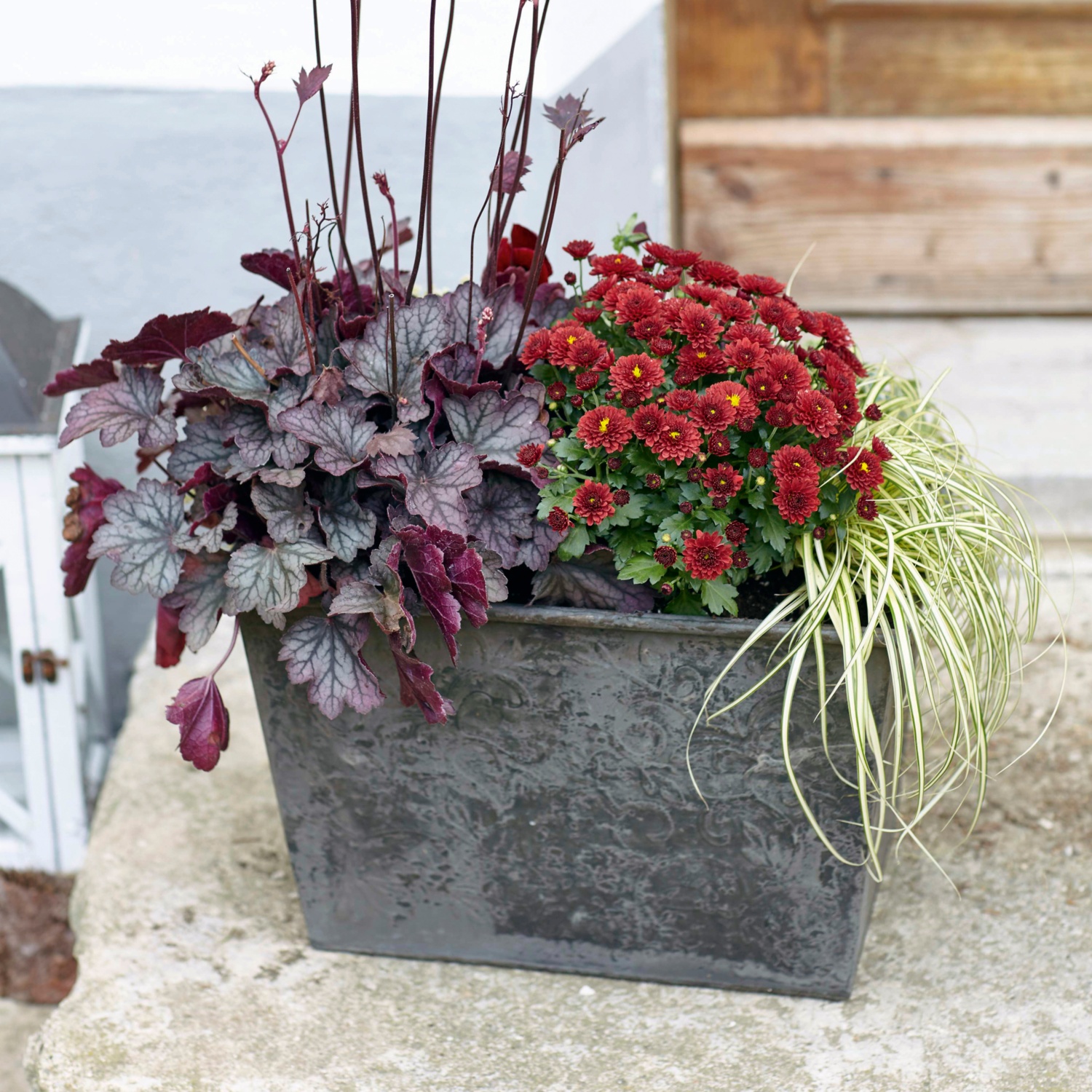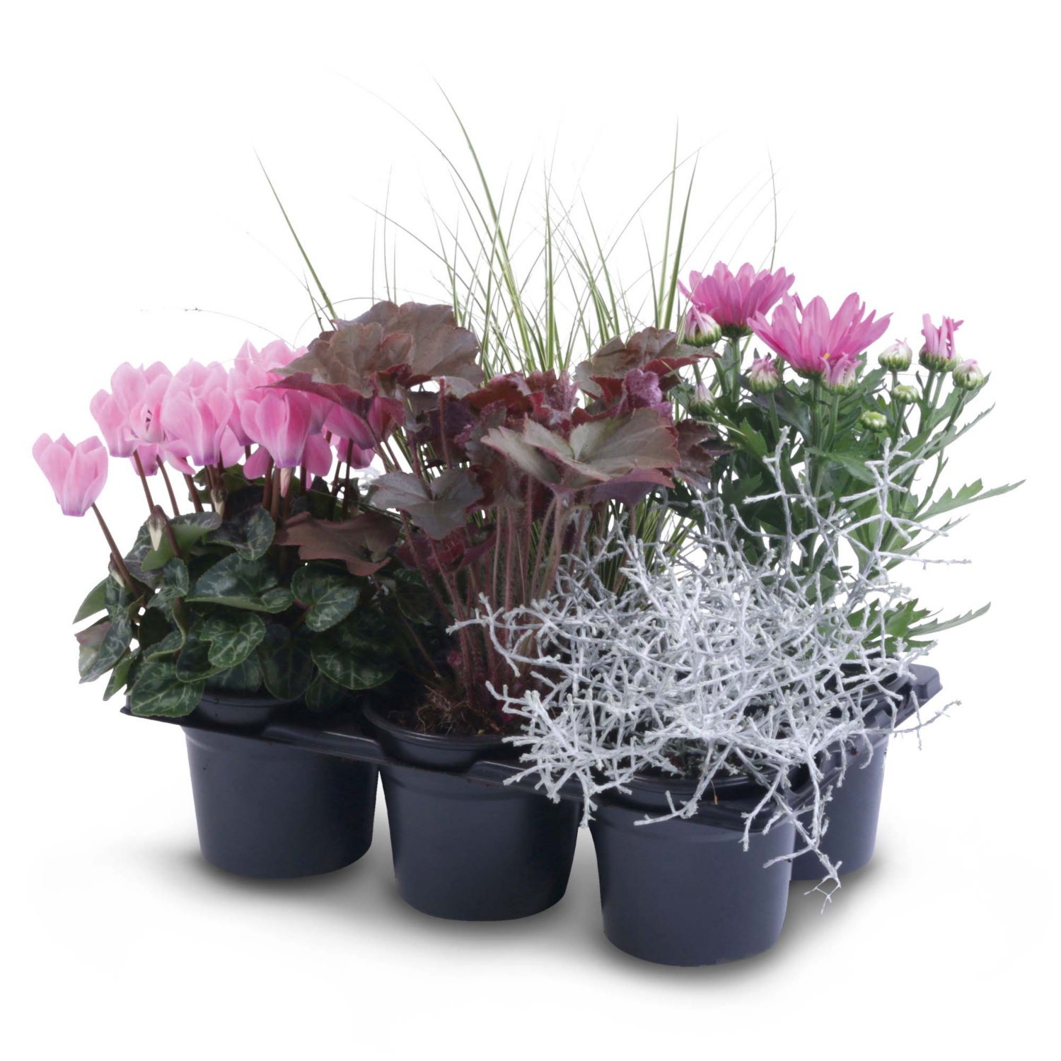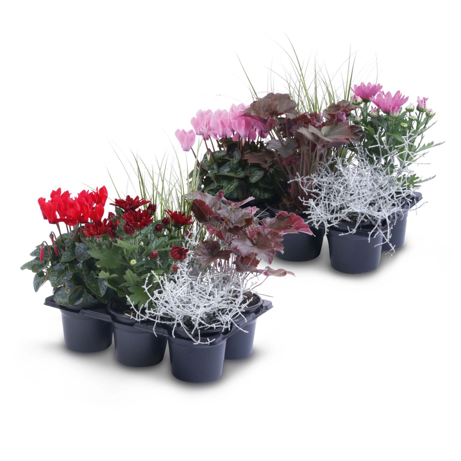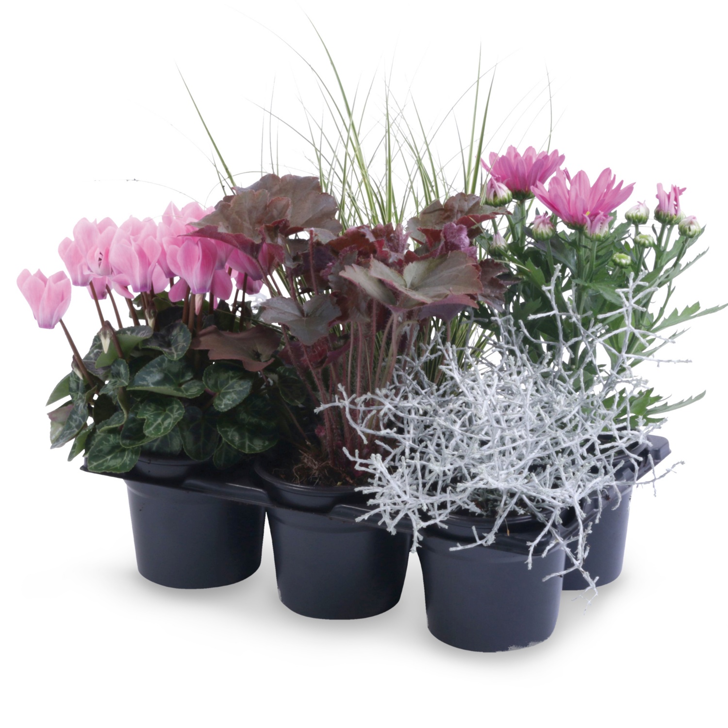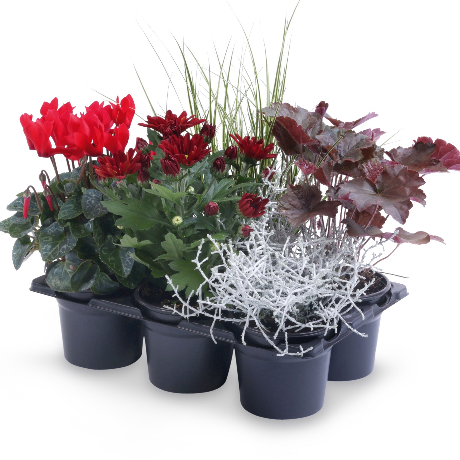 im 9,5-cm-Topf Höhe inkl. Topf: mind. 15 - 25 cm (je nach Sorte) verschiedene Herbstblüher und Strukturpflanzen gemischt im 6er-Tray wie Calluna, Heuchera, Cyclame etc. besonders geeignet für bepflanzte Arrangements