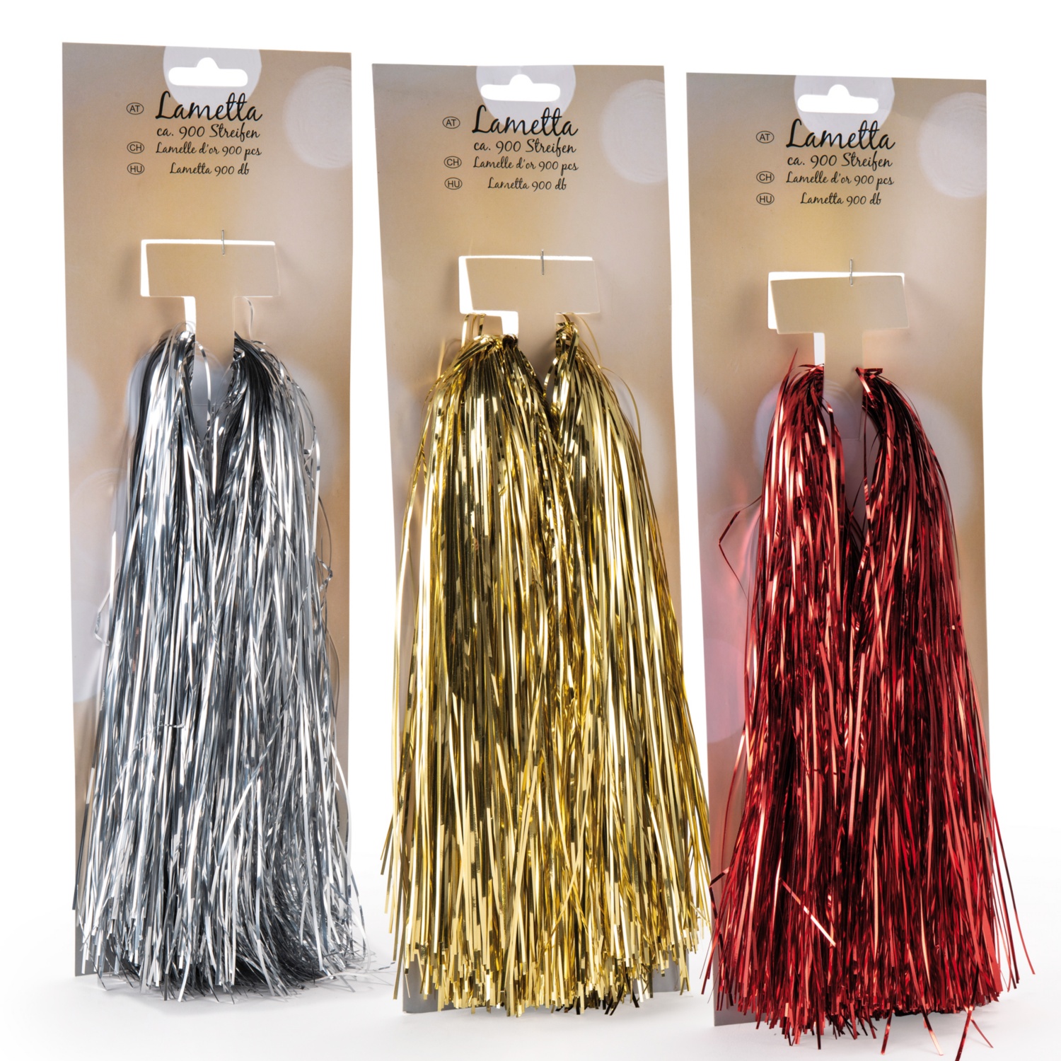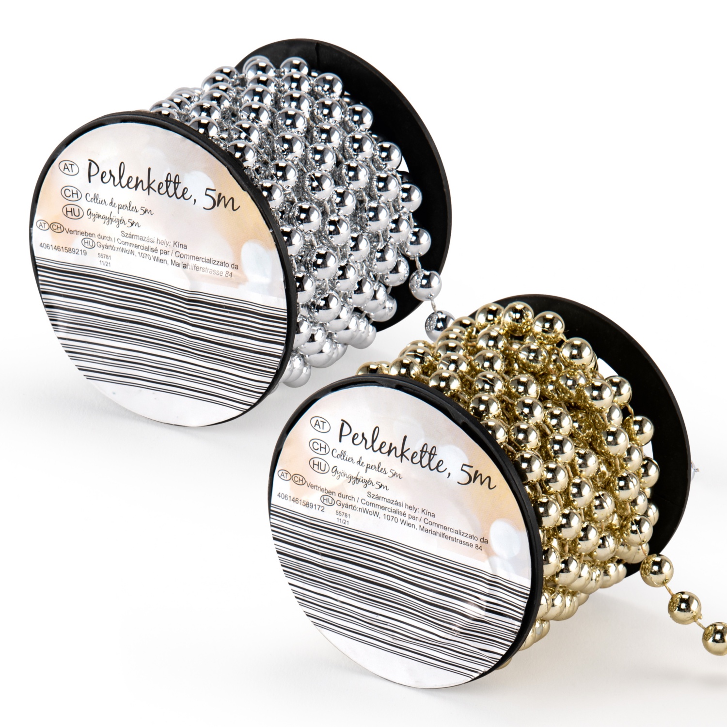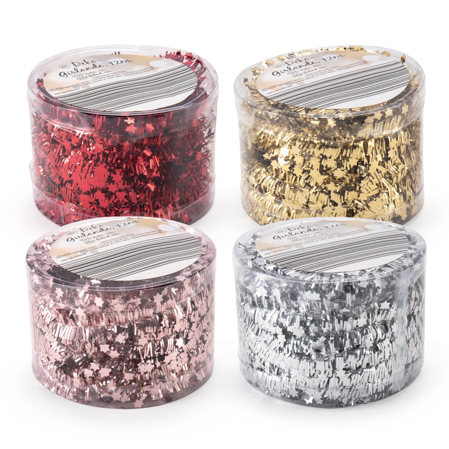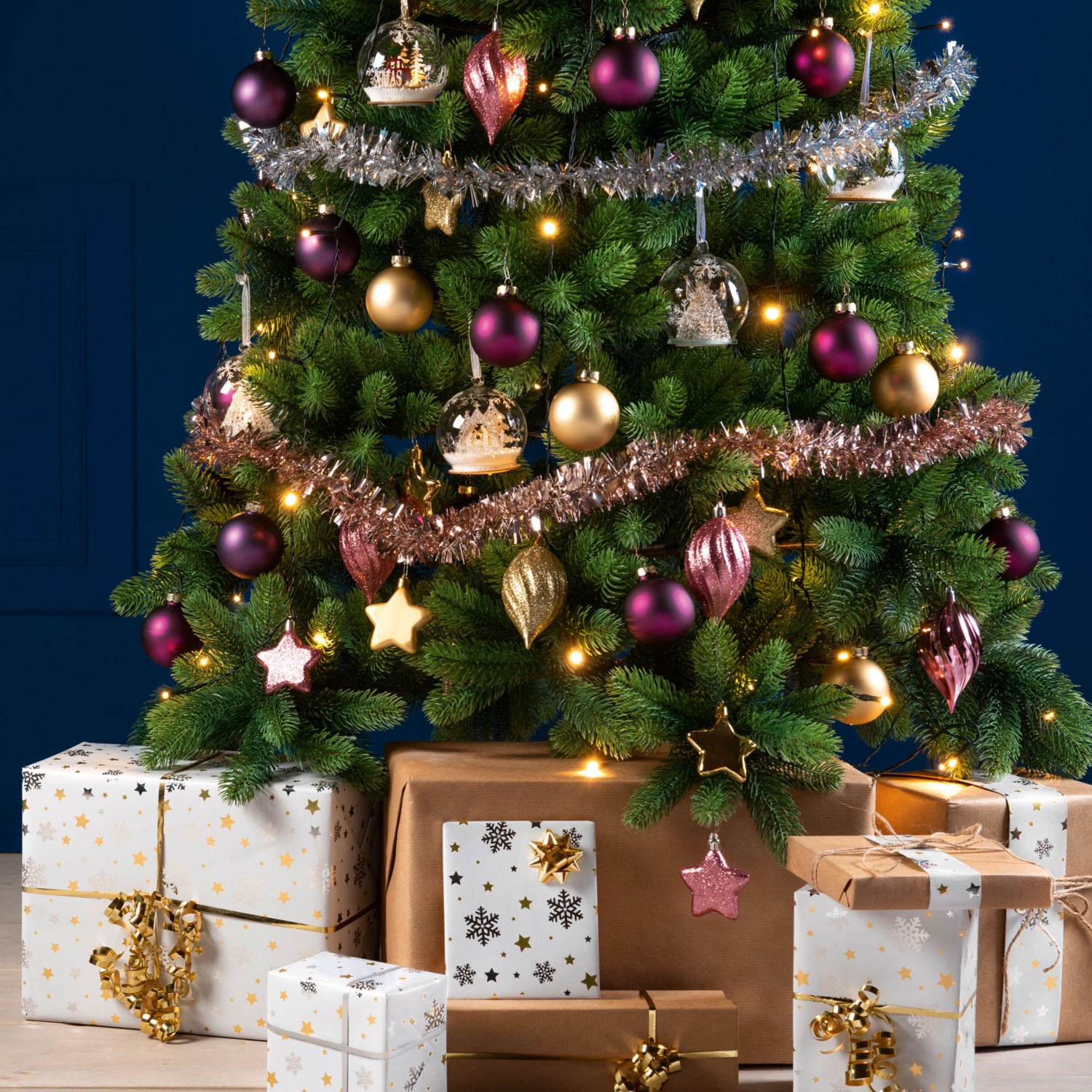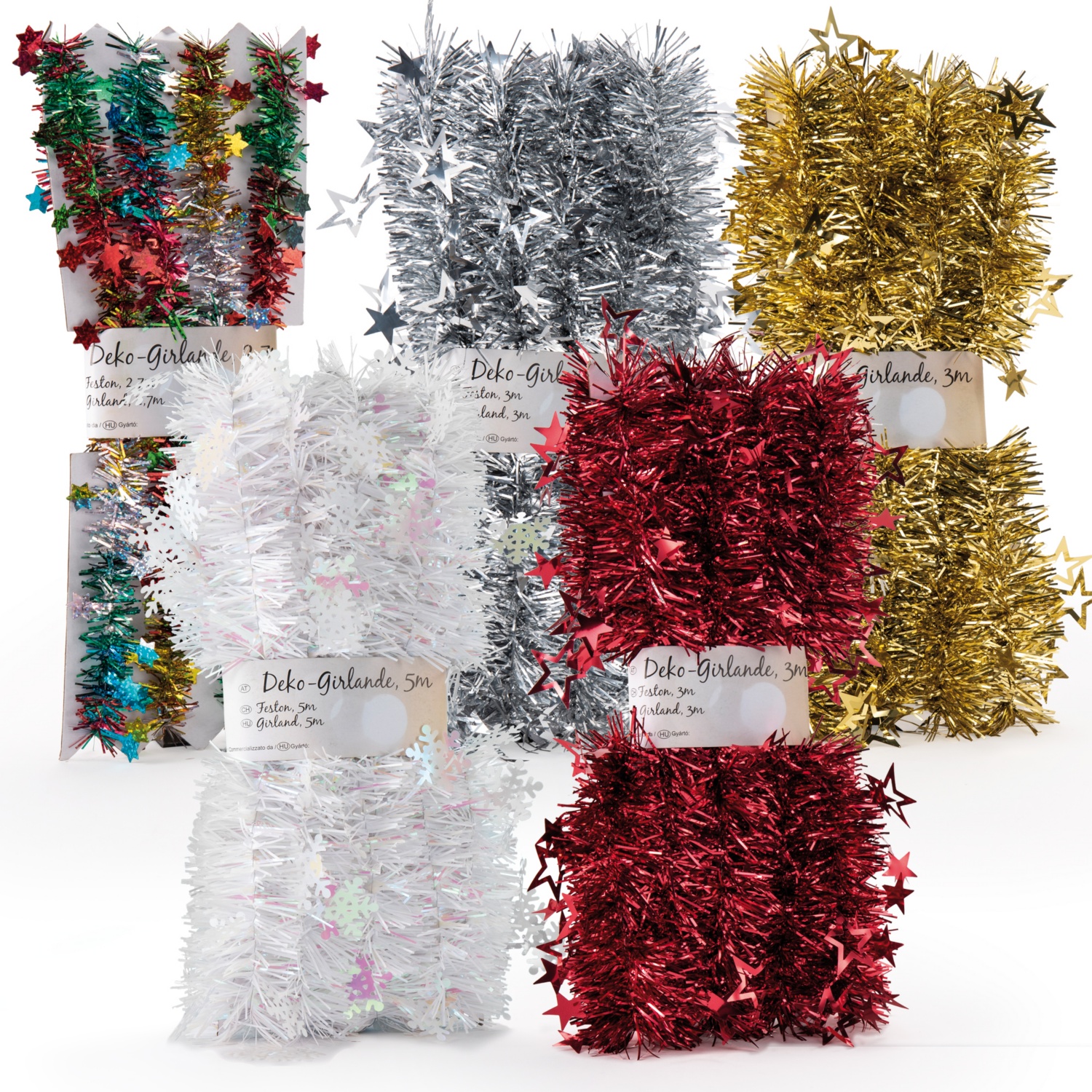 verschiedene Dekorationen für Weihnachtsbäume, z. B. Lametta, Girlanden, Perlenketten