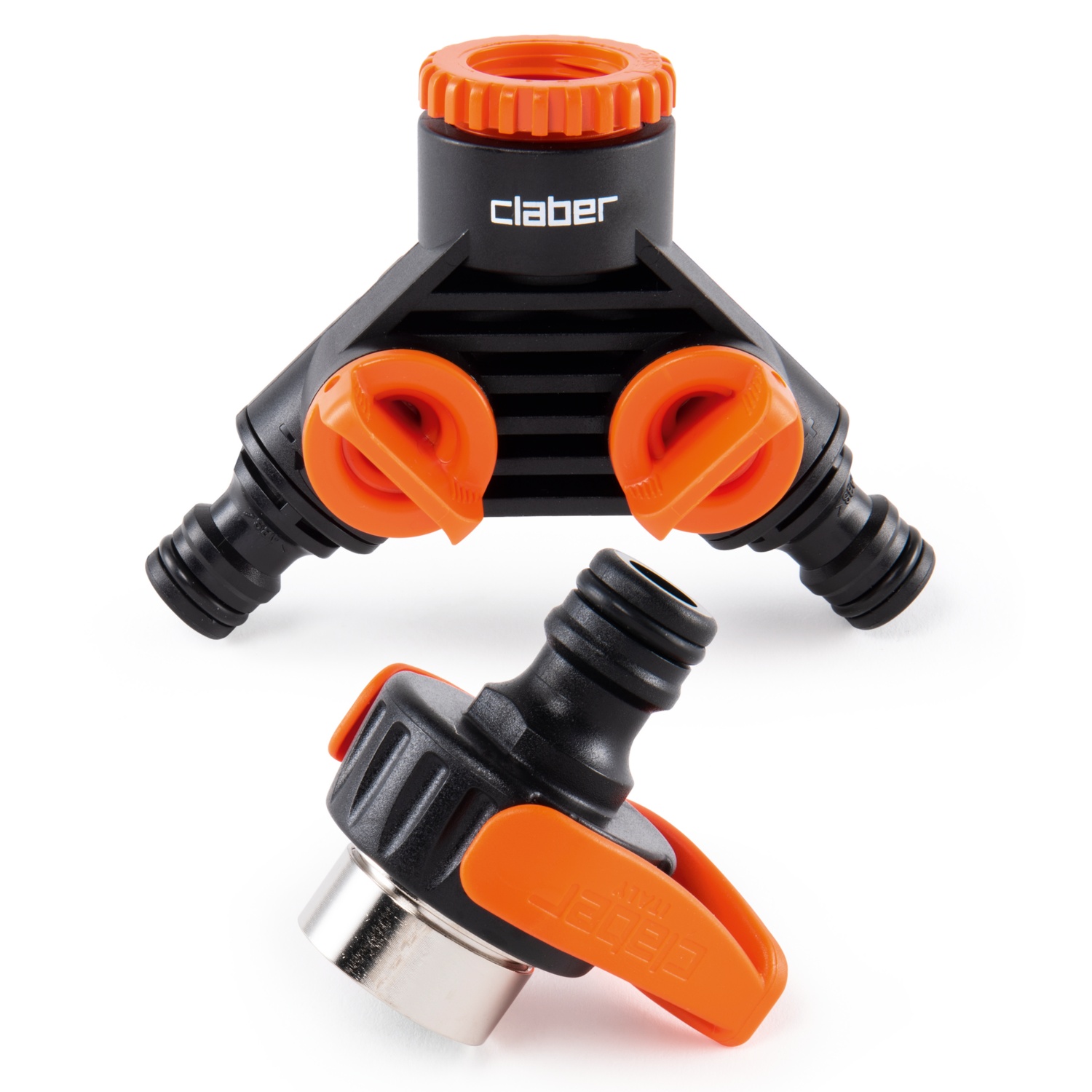 • Doppelhahn-Anschlussverteiler: für 3/4” oder 1/2”, stufenlos regulierbare Ausgänge,