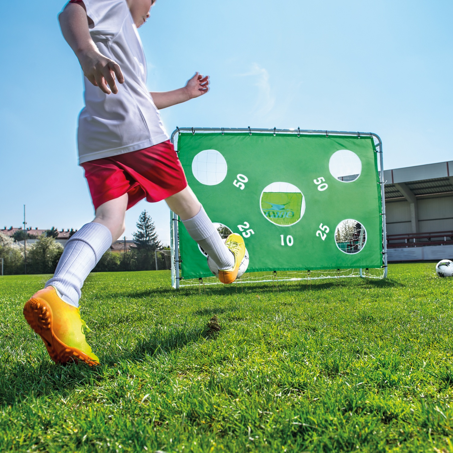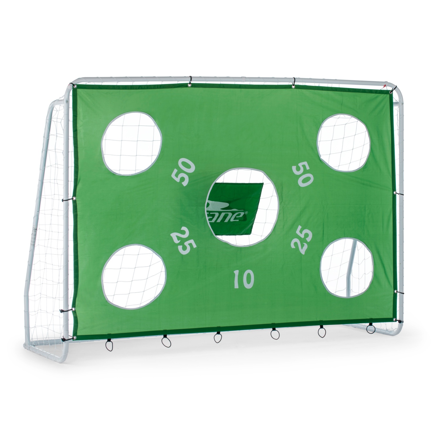 • Fußballtor mit Torwand: mit 5 Schusslöchern, Maße: 240 x 170 x 85 cm (B x H x T) oder