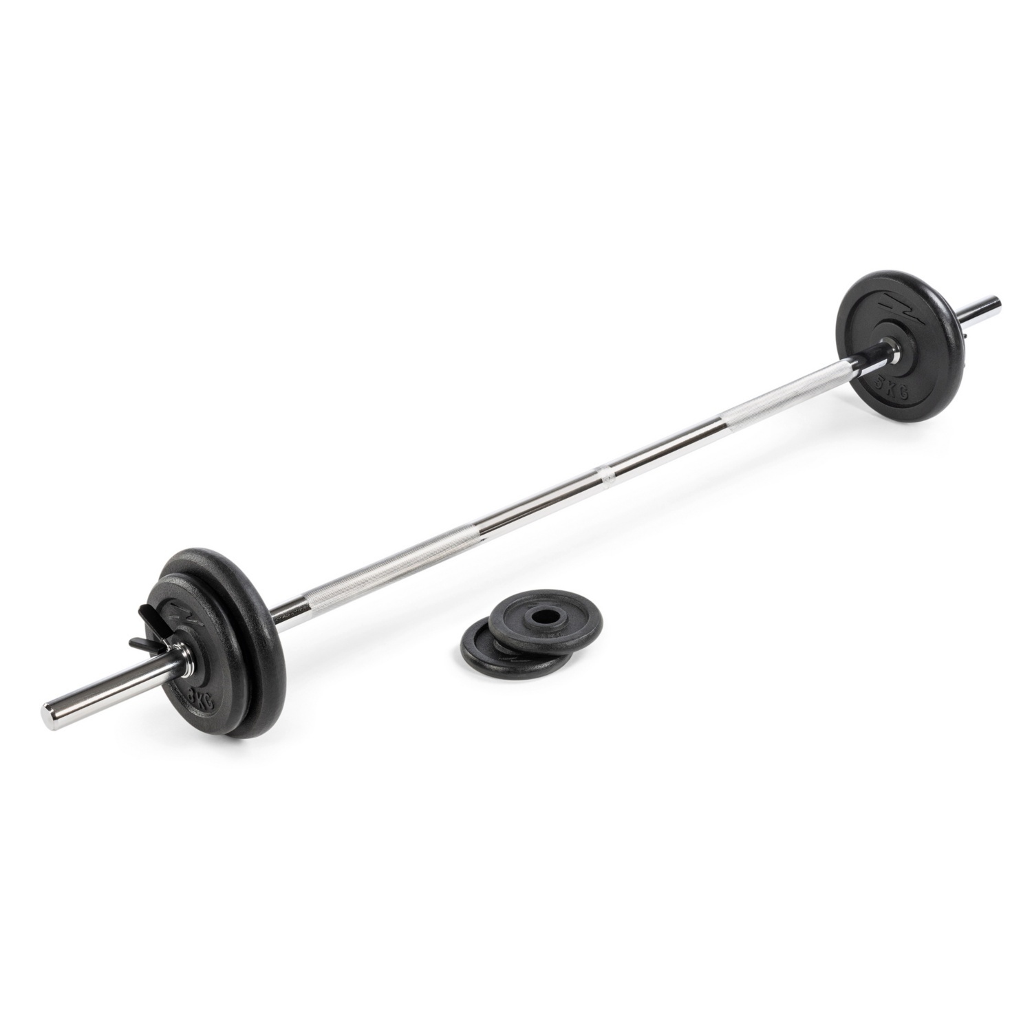 • 1 x zweiteilige Langhantelstange aus verchromten Stahl