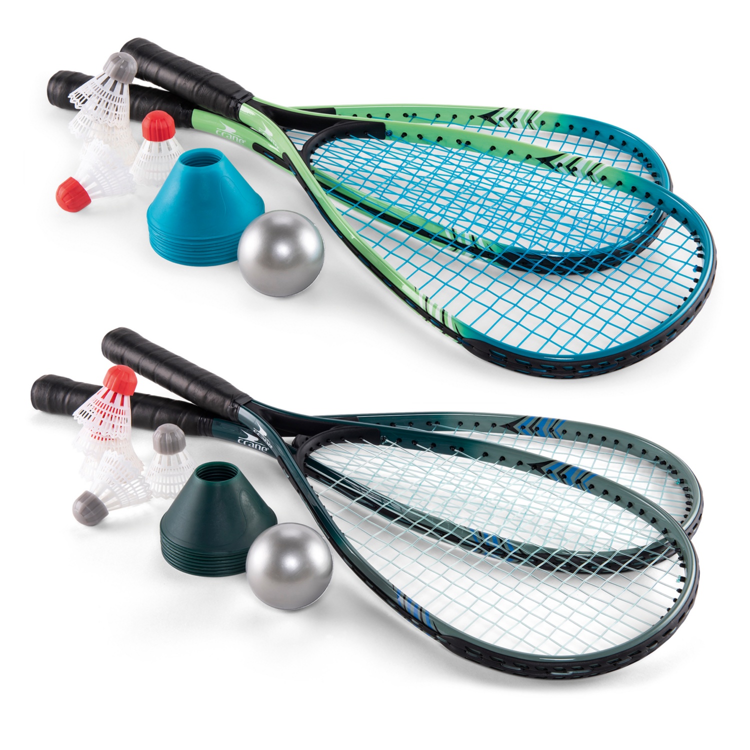• 2 Schläger mit Aluminium-Rahmen, bespanntmit robusten Nylonsaiten,