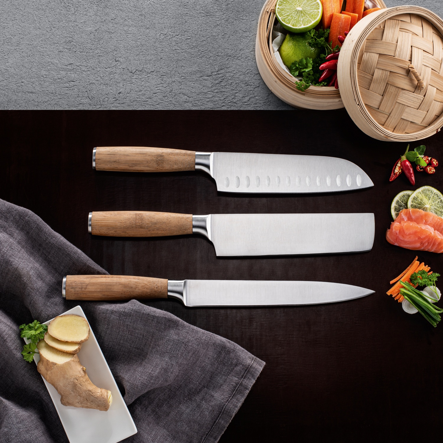 Klinge aus hochwertigem Chrom-Molybdän-Vanadium-Stahl, Griff in edler Holz-Optik, Griffende aus hochwertigem Edelstahl