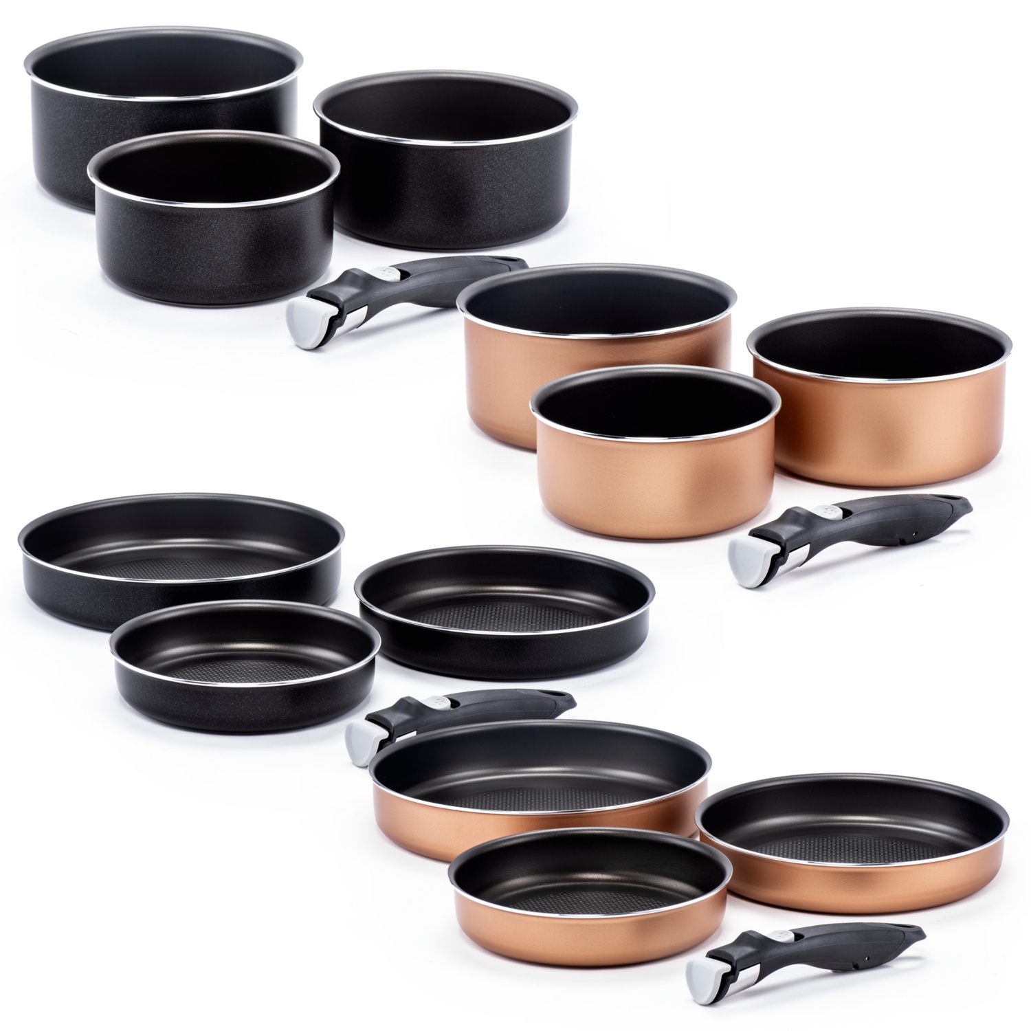 durch den abnehmbaren Griff mit komfortabler Einhandverriegelung perfekt ineinander stapelbar, hochwertige Antihaftbeschichtung, backofengeeignet (ohne Griff), spülmaschinengeeignet