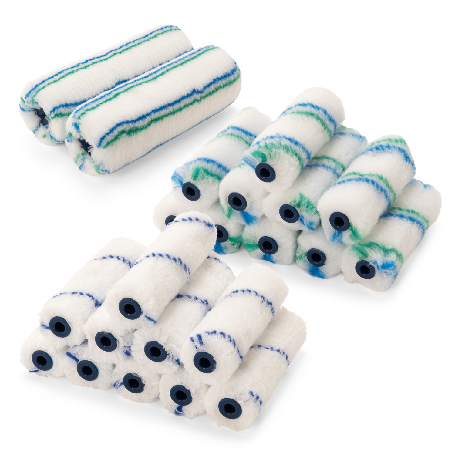 • Packung mit 10 kleinen Flächenrollern für Farben:10 cm Breite Polyesterfaser, 15 mm Kerndurchmesser, Gesamtdurchmesser ca. 39 mm, Arbeitsbreite 10 cm, Florhöhe 12 mm, 6 mm Stecksystem
