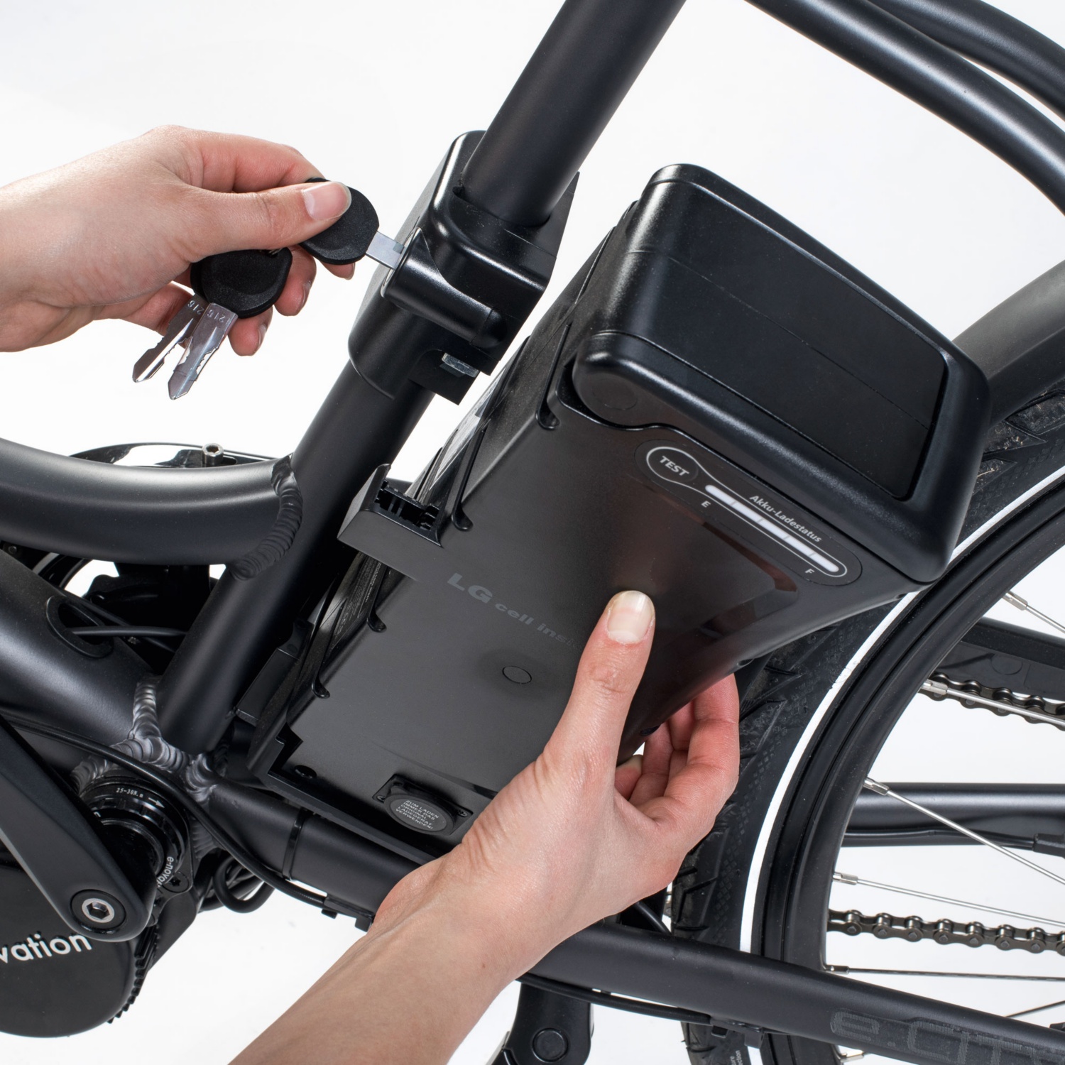 • Akku:leistungsstarker Sideclick-Sitzrohrakku mit LG Markenzellen, 36 V, 12,8 Ah, 461 Wh, ca. 500 Ladezyklen, Reichweite: max. 140 km (je nach Fahrweise)