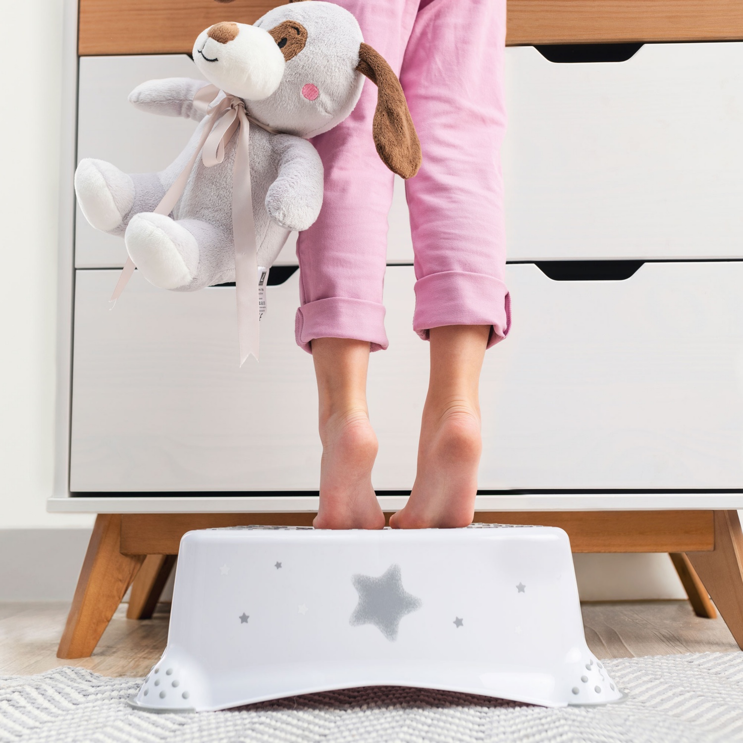 Tritthocker: sicherer Halt durch gummierte Füße und rutschfeste Oberfläche, max. Belastbarkeit: 80 kg oder
