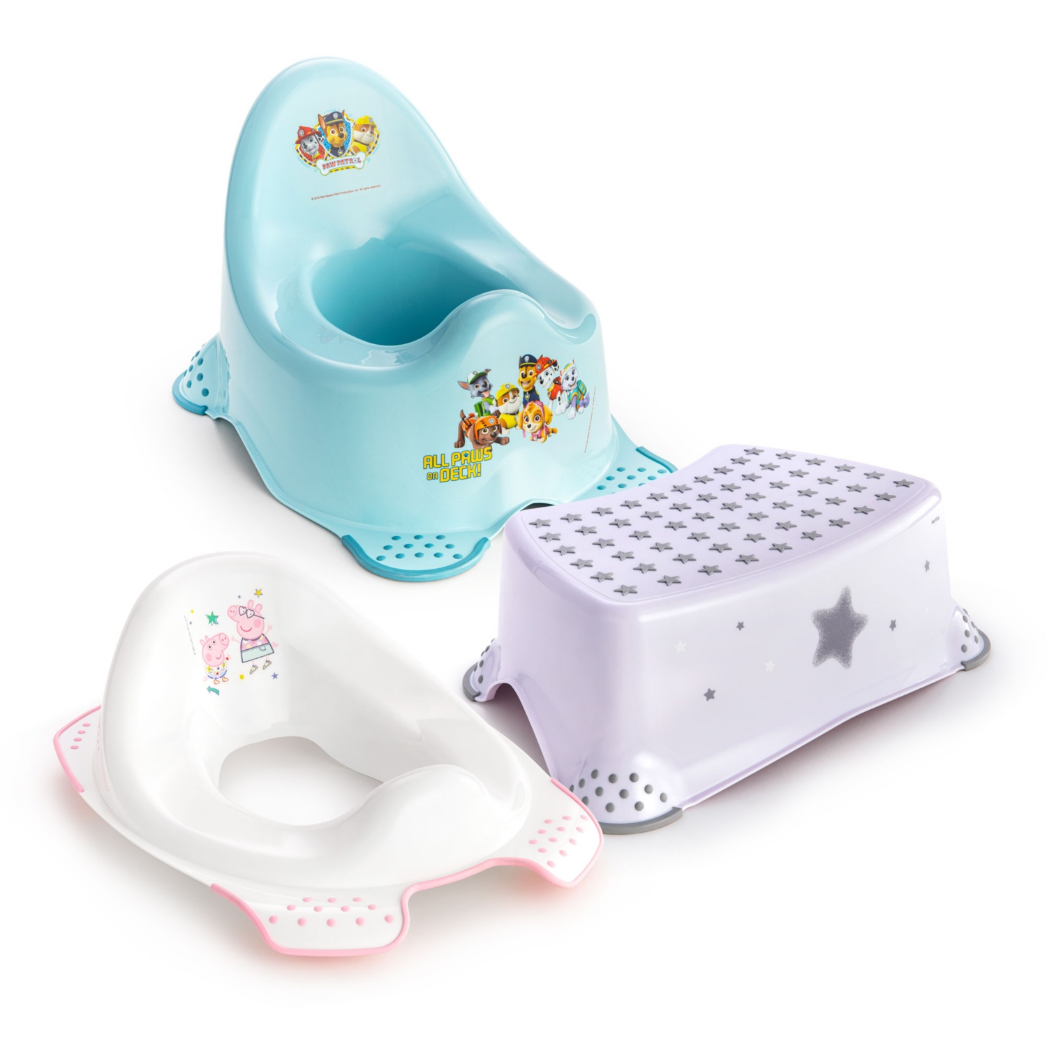 Toilettensitz: passend für alle handelsüblichen Toiletten, mit gummierter Auflagefläche für festen Halt auf der WC-Brille, anatomische Sitzfläche mit kleiner Lehne, max. Belastbarkeit: 25 kg, hygienisch rein durch Spritzschutz,