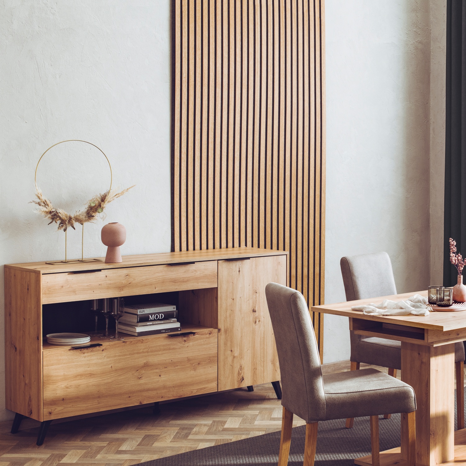 • Eichenpaneele furniert auf 572,5 x 2400 x 19 mm (B x H x T) = 1,374 m²/VE