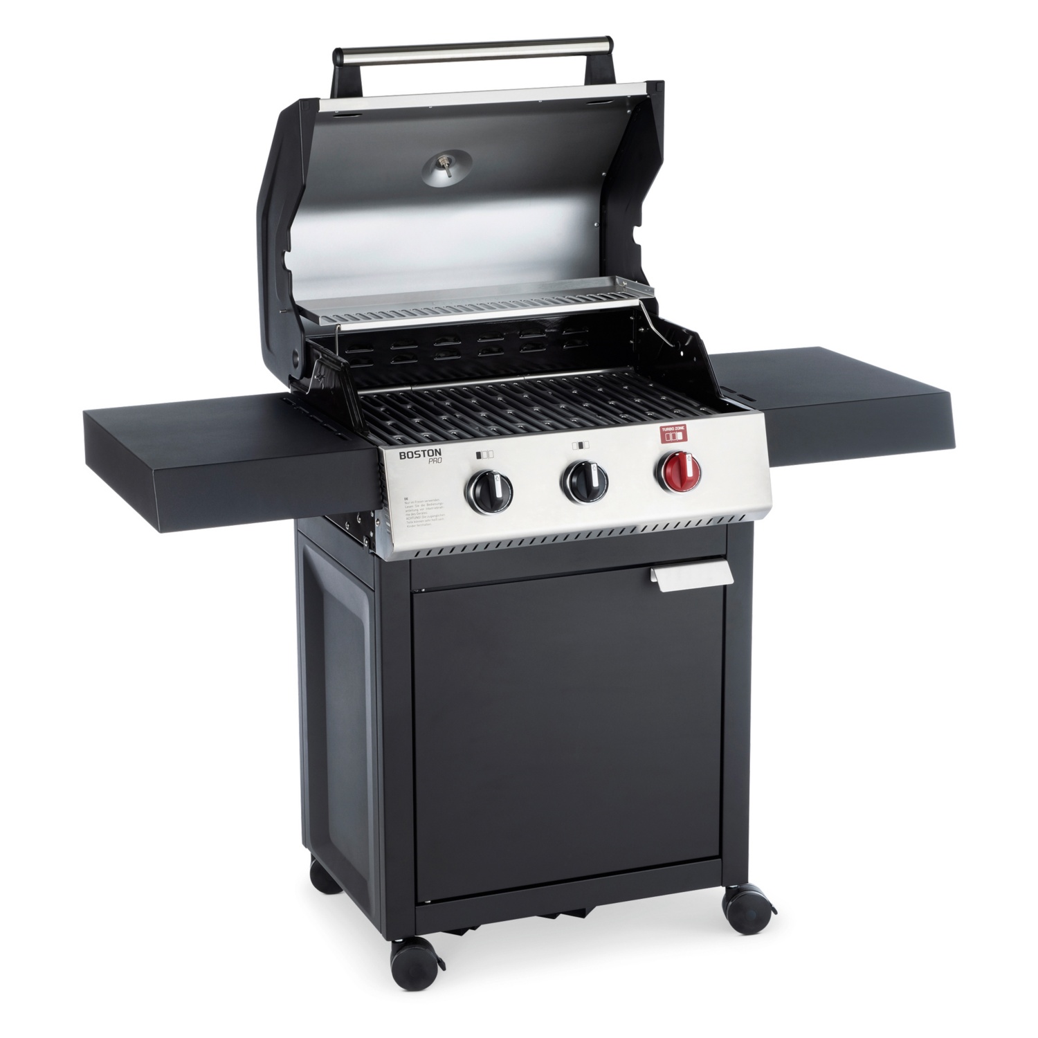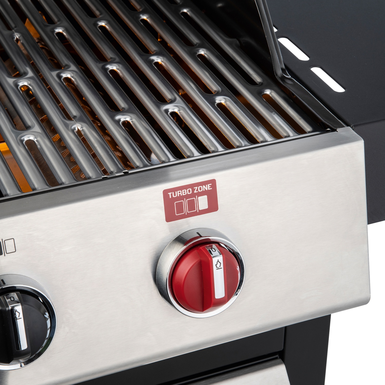 • 3 stufenlos regulierbare Edelstahlbrenner, davon 2 x 3,5 kW und 1 x 4,2 kW (TURBO ZONETM) für direktes und indirektes Grillen