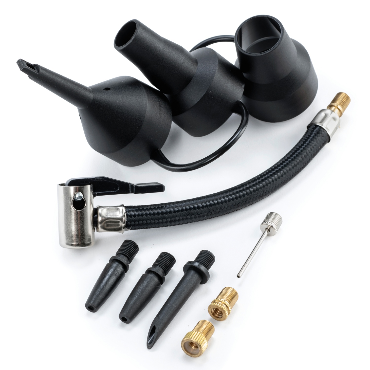 praktisches Kombiset – ideal zum Aufpumpen von Auto-/Motorradund Fahrradreifen, Luftmatratzen, Schlauchbooten etc., inkl. umfangreichen Adapter-Set, aufgrund der kompakten Bauform eignet sich dieses Set perfekt für Reisen, Ausflüge und Camping Akku Volumenpumpe: