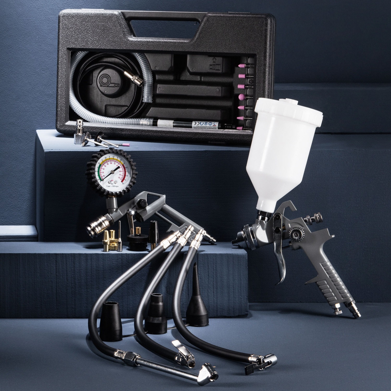 • Druckluft-Farbspritzpistole:für alle Lackierarbeiten (Niederdrucksystem, stufenlose Einstellung der Farbmengen und Umstellung von Punkt- auf Breitstrahl),