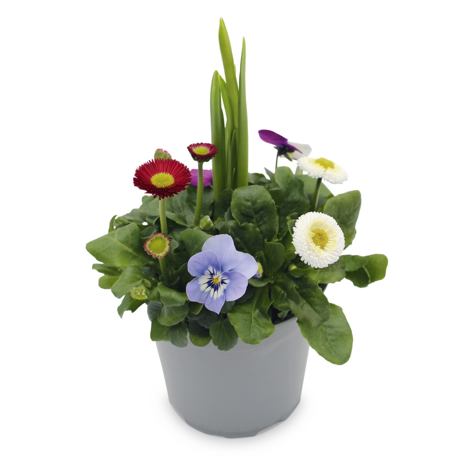 im 14-cm-Topf, Mix aus verschiedenen Frühlingsblühern wie z.B. Narzisse, Hornveilchen und Bellis, in verschiedenen Blütenfarben
