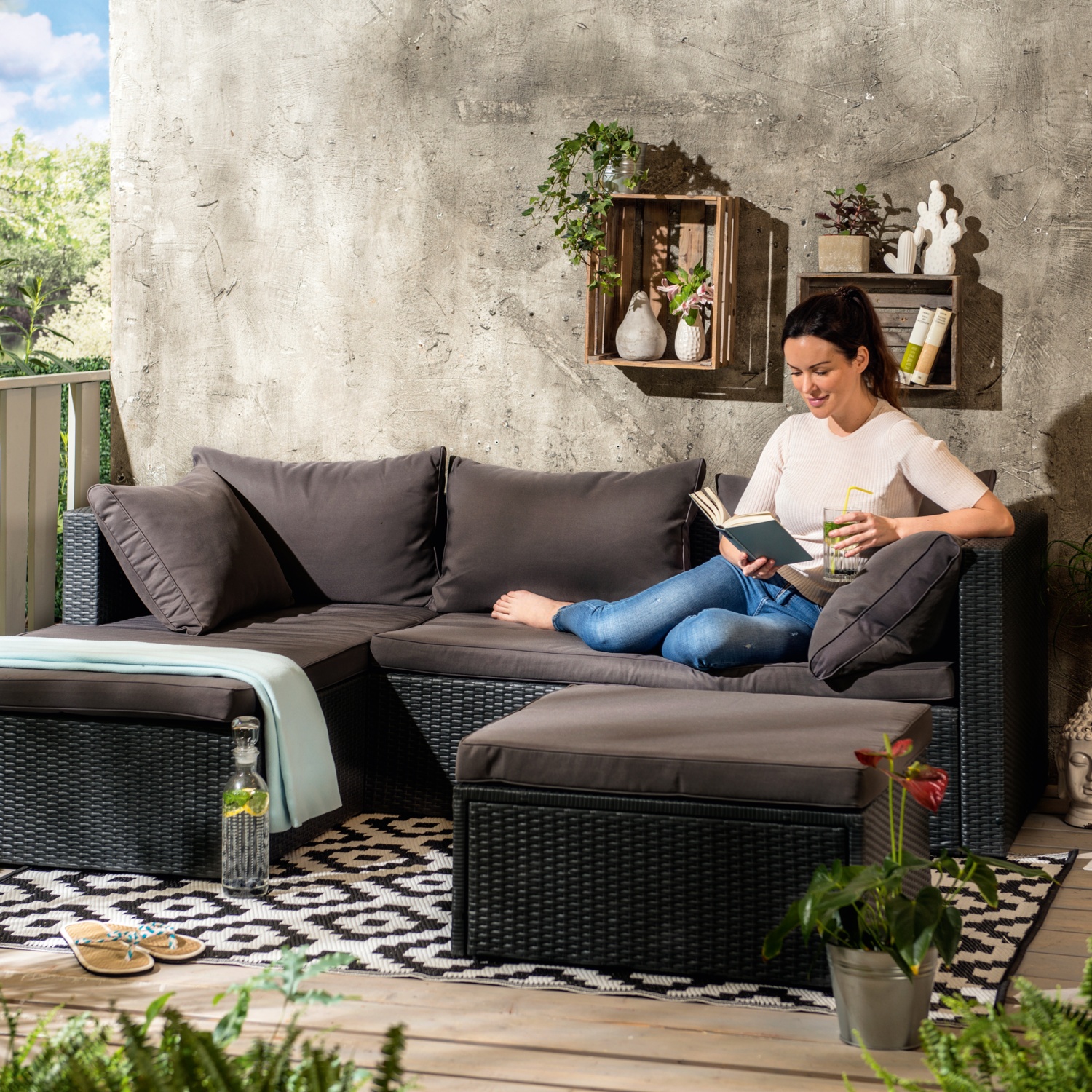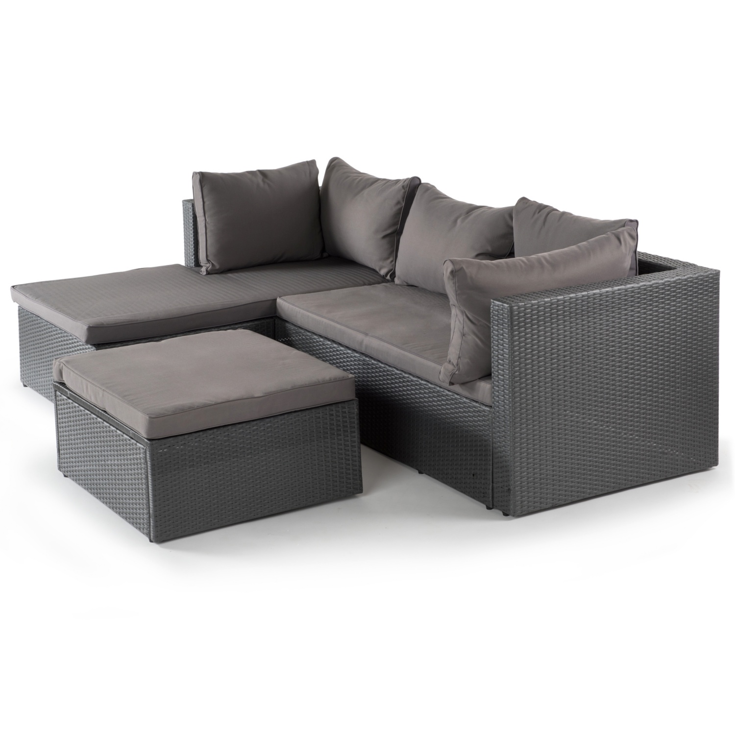• bestehend aus einem Bankteil für 2 Personen, einer Liege und einem Hocker, der auch als Tisch verwendet werden kann