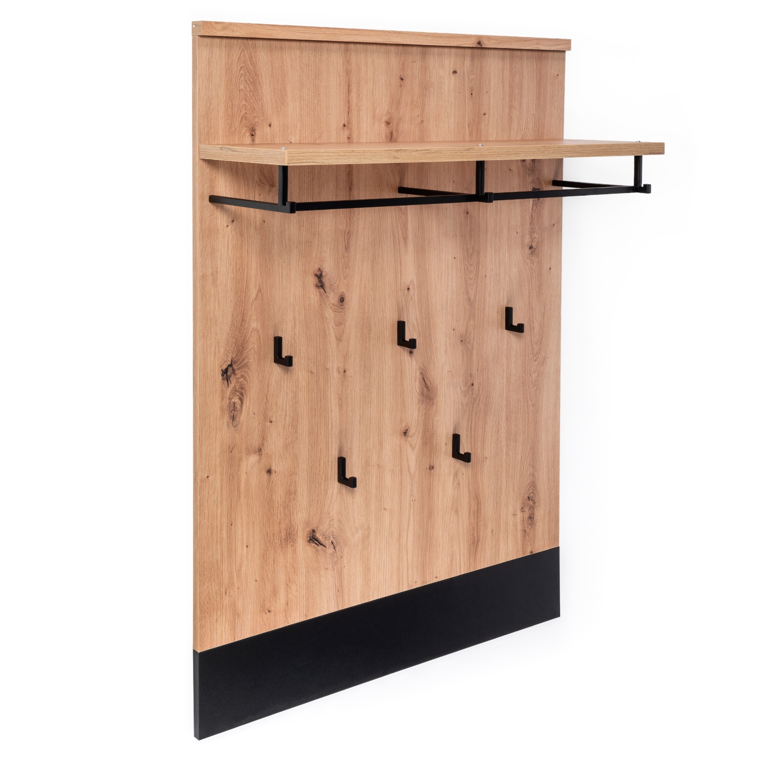 • Paneel mit Hutboden: Metallreeling mit drei Stützen schwarz matt, 5 Handtaschenhaken, Paneel mit Aushängesicherung, Maße: 80 x 114 x 22 cm (B x H x T) und