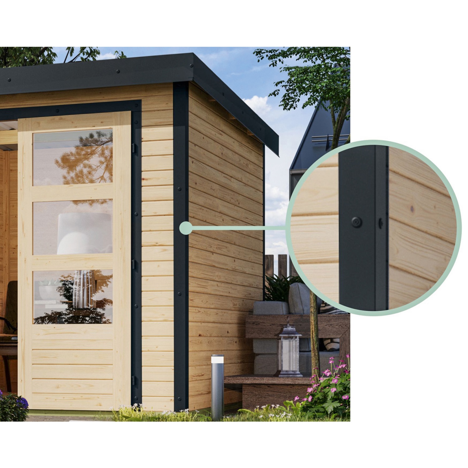 HochwertigeMaterialien wie nordische Fichte, Stahlecken und Trapezblechdach