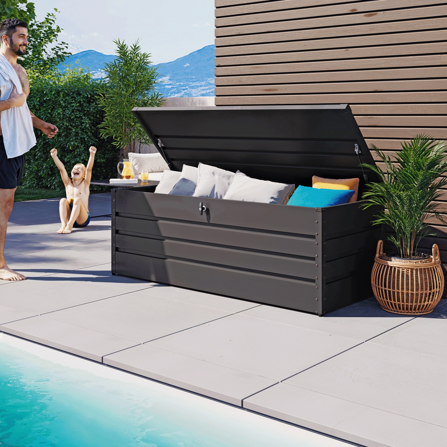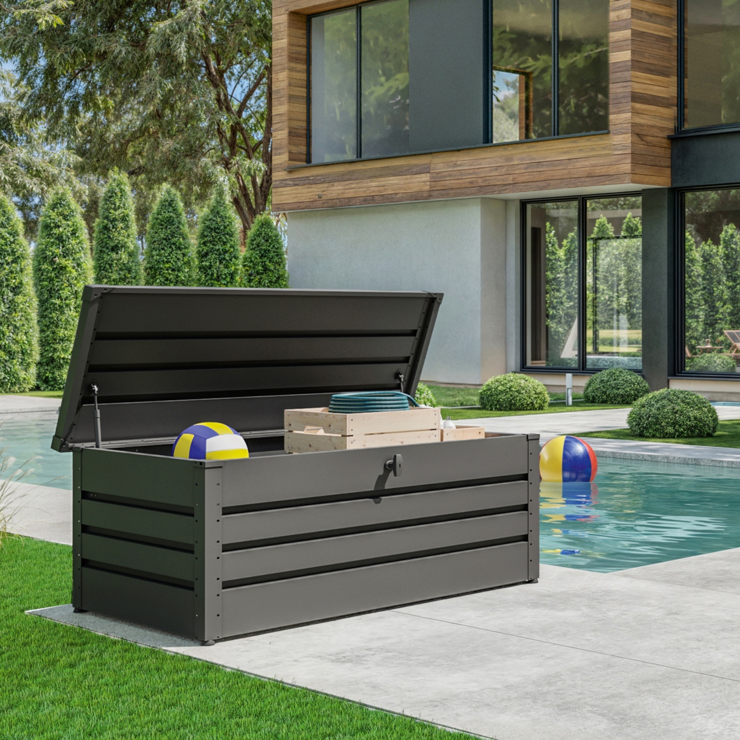 Praktisch, elegant und äußerst robust – die Freizeitbox aus Stahl ist die ideale Lösung für alle, die Wert auf stilvolle und sichere Aufbewahrung im Außenbereich legen. Egal ob Auflagen, Gartenzubehör oder Freizeitartikel: Diese Box schützt zuverlässig vor Regen, Schmutz und unbefugtem Zugriff.
