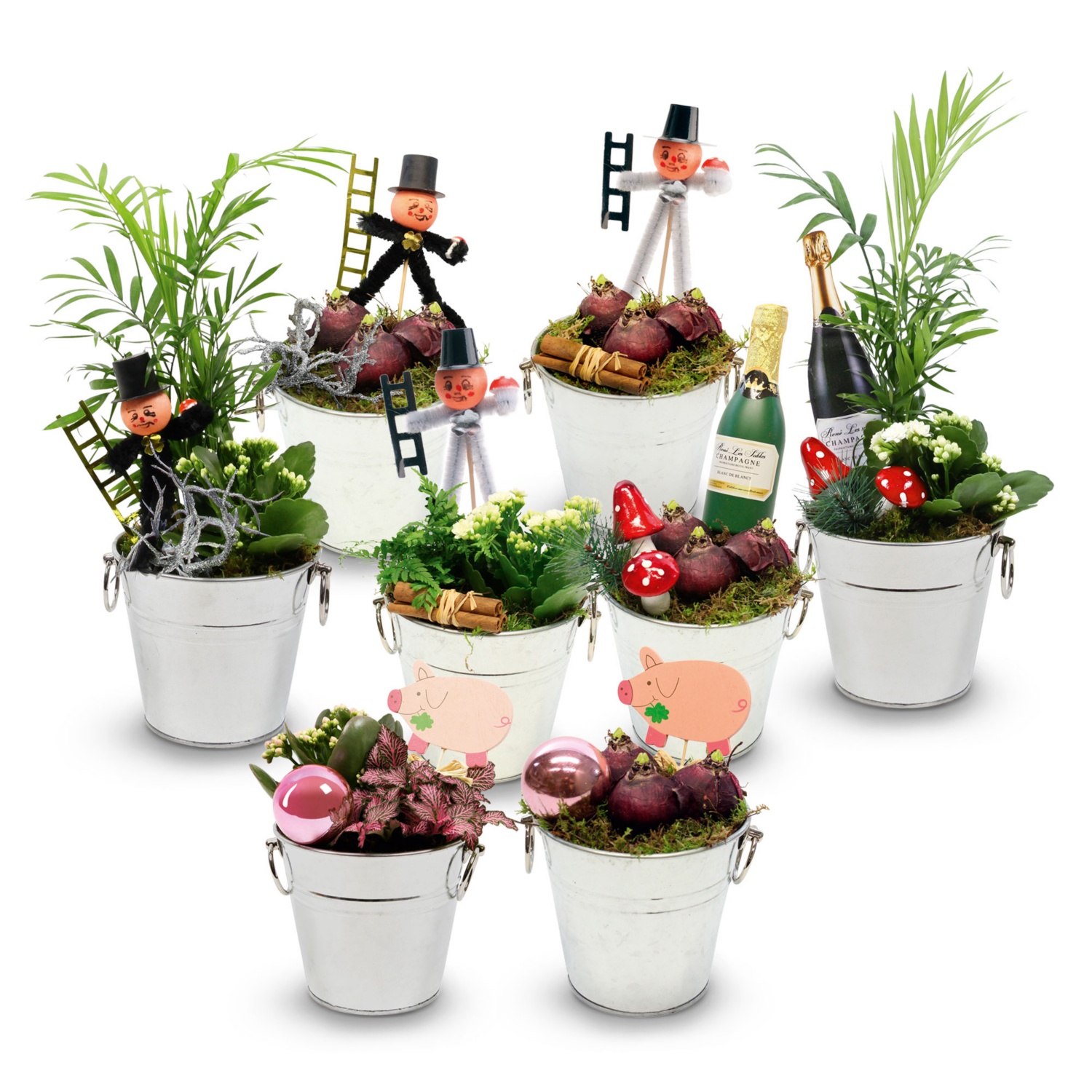 Ø Gefäß: ca. 15 cm, Höhe: ca. 20-35 cm (je nach Modell) bepflanzt mit einer Blüh- und einer Grünpflanze, inkl. Silvesterdeko