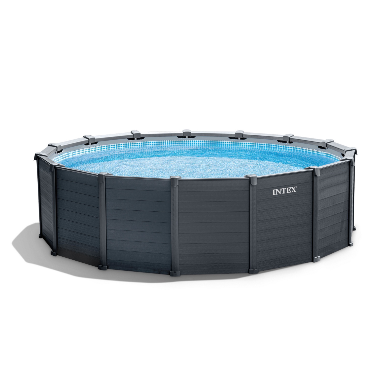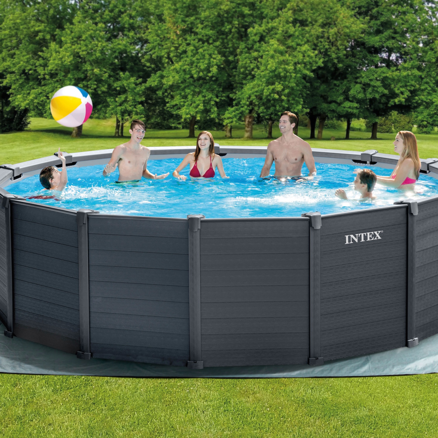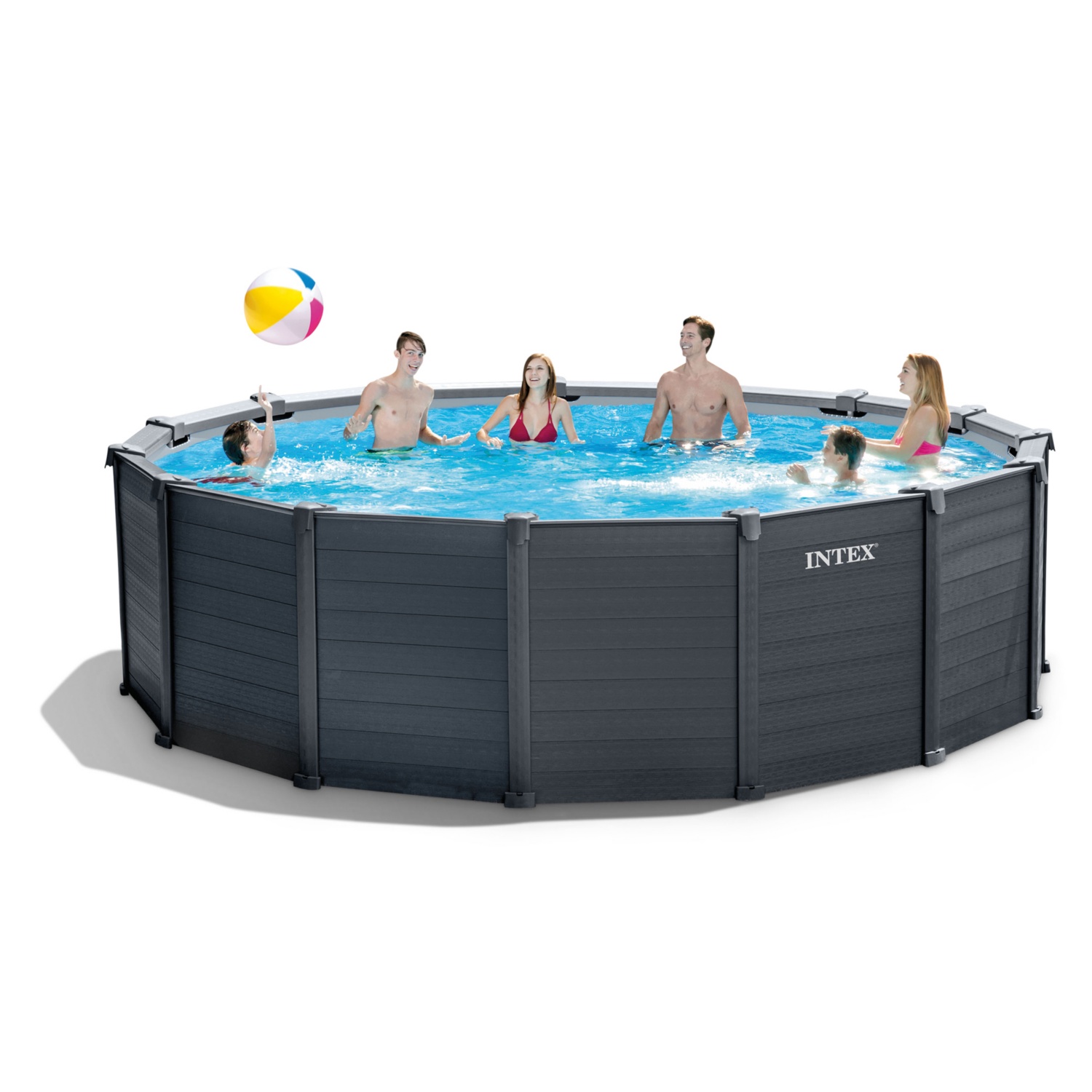 Artikelnummer: 572664 Die neuen High-End-Panel-Pools von INTEX® bringen Qualität und ansprechende Optik in Ihren Garten. Der Graphite Panel Pool bietet der gesamten Familie Platz zum Spielen, Herumtollen oder auch zum Relaxen. Die in der Farbe "Graphit" gefertigten Kunststoffpaneele verfügen nicht nur über eine hochwertige Naturholzoptik, sondern sorgen auch für Stabilität, Festigkeit und Beständigkeit. Geliefert wird dieser Pool mit einer umfangreichen Ausstattung inklusive Sandfilteranlage. Diese sorgt nicht nur für ein sehr gutes Filterergebnis, sondern verfügt auch über alle benötigten Anschlüsse. Die INTEX® Wasserbelebungstechnologie verbessert die Zirkulation, Filtration und die Wasserklarheit Ihres Pools, sowie die Luftqualität. Eine Abdeckplane sowie eine Bodenschutzplane dienen zum zusätzlichen Schutz und reduzieren die Verschmutzung im Pool. Die mitgelieferte Sicherheitsleiter bietet Ihnen nicht nur eine komfortable Ein- und Ausstiegsmöglichkeit, sondern sichert mit den entfernbaren Stufen den unerlaubten Zugang zum Pool. Technische Daten: