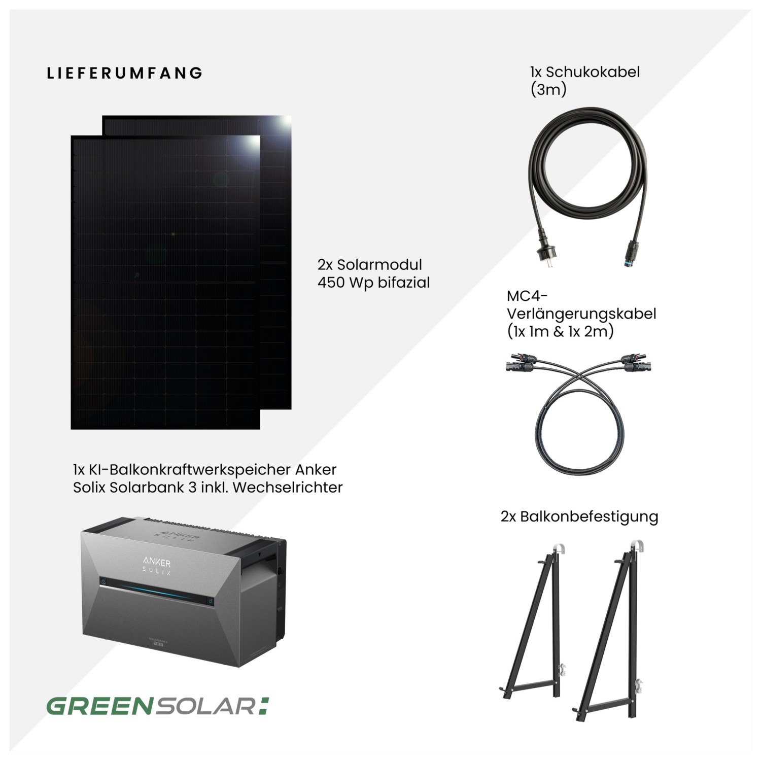 • Komplettset inkl. Balkonhalterungen, 3 m Schuko-Kabel und MC4-Verlängerungen