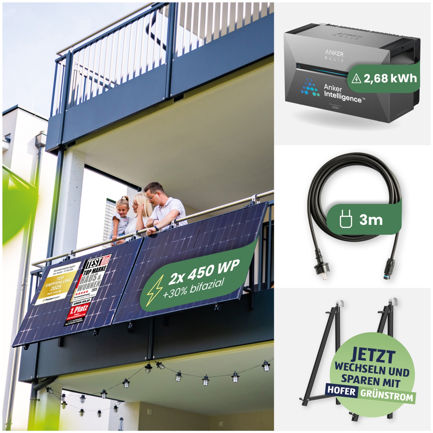 Werbetext:Das Balkonkraftwerk Balkon 900/800W mit der Anker SOLIX Solarbank 3 E2700 Pro vereint zwei 450 Wp-Module mit einem leistungsstarken 2,68 kWh Speicher. Der Wechselrichter ist bereits im Speicher integriert – zusätzliche Geräte brauchen Sie nicht. So können Sie überschüssigen Solarstrom ganz einfach speichern und genau dann nutzen, wenn du ihn brauchst – etwa abends oder bei schlechtem Wetter. Die Anker SOLIX Solarbank 3 verfügt über eine integrierte Schuko-Steckdose direkt am Gerät, über die Sie bei einem Stromausfall Geräte wie den Kühlschrank weiterhin mit Energie versorgen können. Das System ist wetterfest, modular erweiterbar und wird komplett mit Balkonhalterungen, 3 m Schuko-Kabel und zwei MC4-Verlängerungskabeln geliefert – für einen sofortigen Start in die eigene Stromunabhängigkeit.