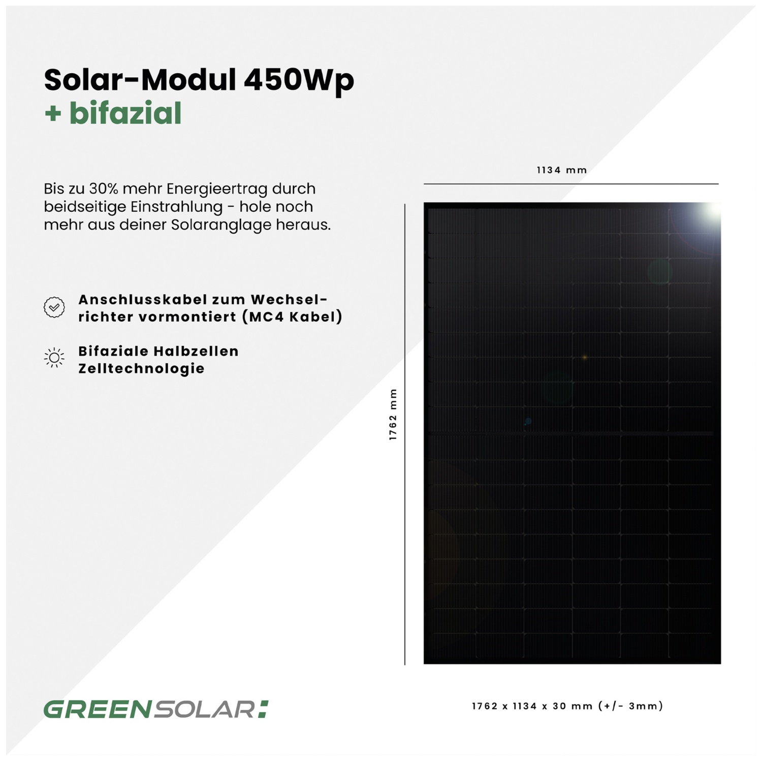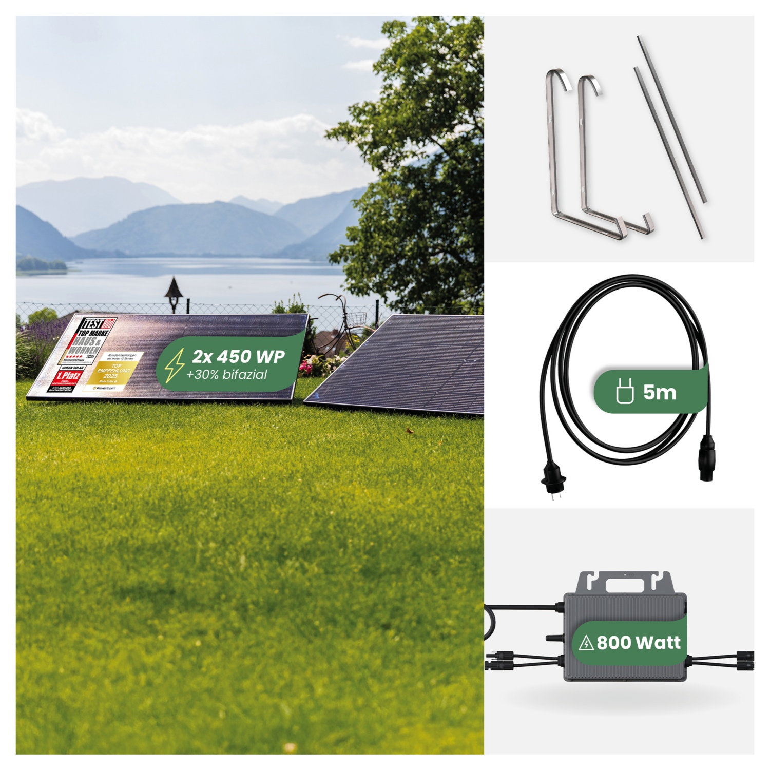 • 2x 450 Wp-Module + 800 W Wechselrichter– starke Leistung, kompakt verpackt