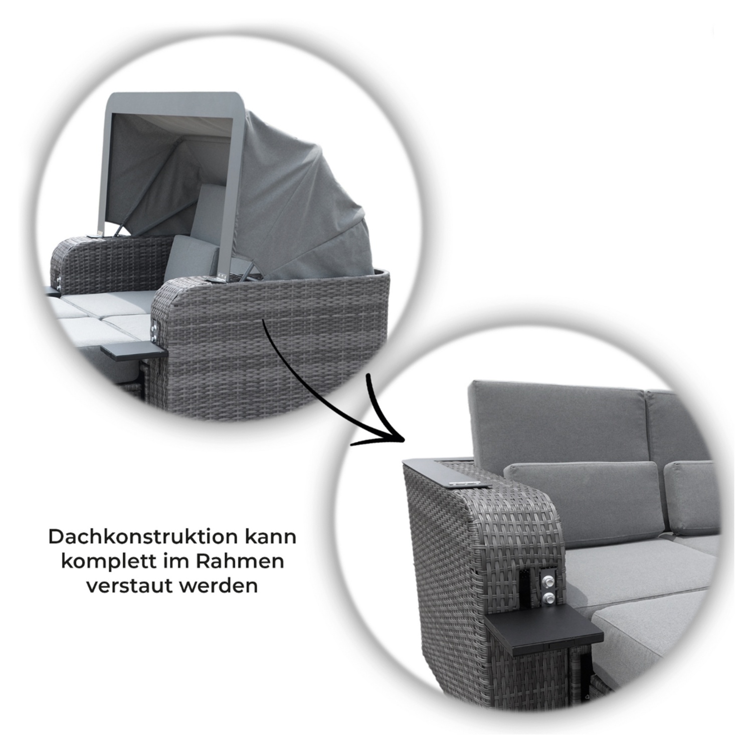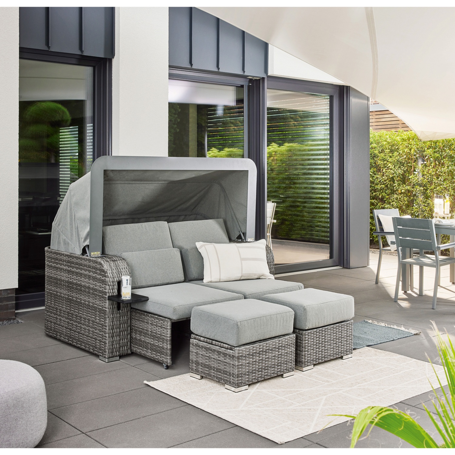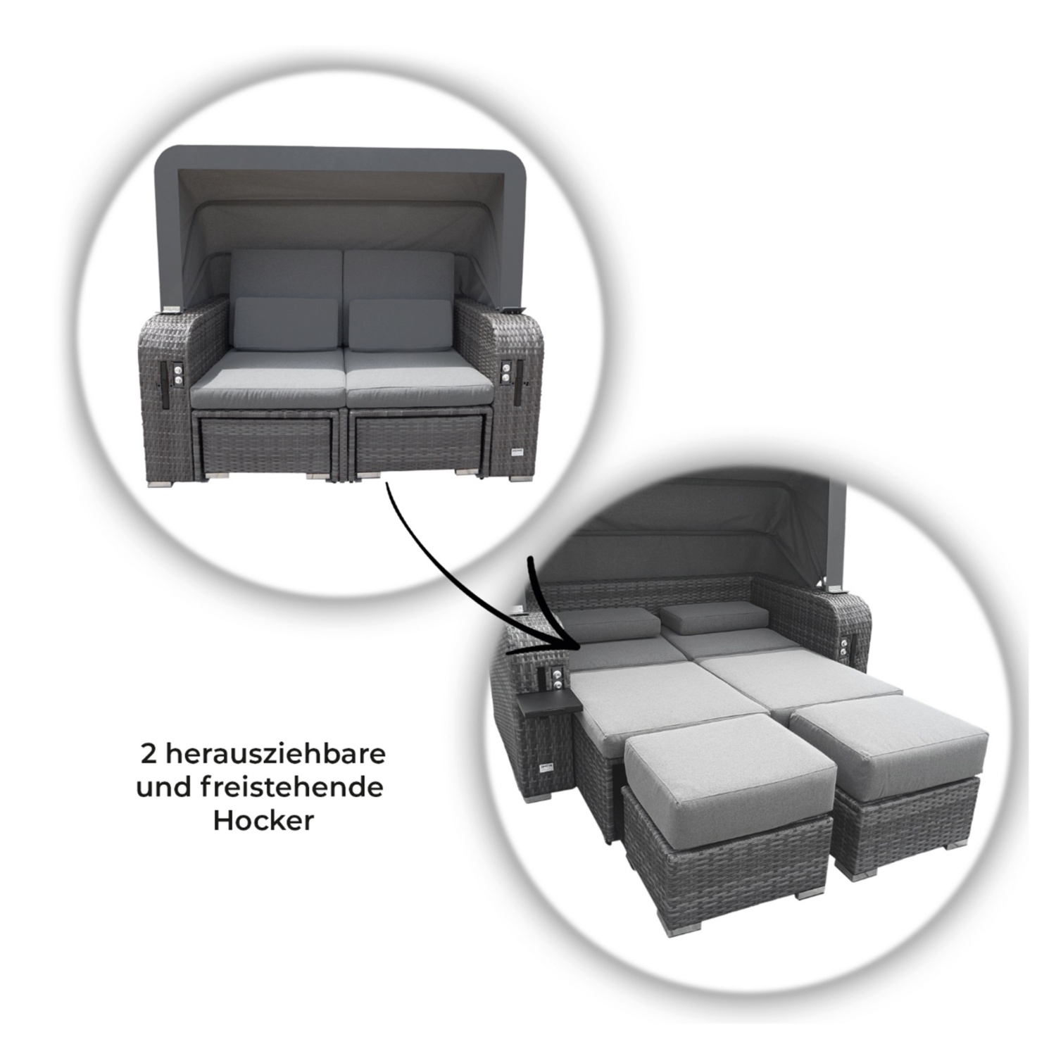 Im Grundzustand wirkt HOLBY wie ein besonders bequemes Designer-Doppelsofa. Und hier liegt der Luxusfaktor: Die freistehenden, versteckt integrierten Hocker erweitern die Liegefläche oder können als zwei zusätzliche Sitzplätze genutzt werden. Per Knopfdruck lässt sich die Liegefläche mittels geräuschloser Gasdruckfedern ausfahren, ganz ohne Stromanschluss. Das praktische Sonnendach lässt sich ganz einfach aufstellen und die beiden integrierten Ablageflächen bieten im ausgezogenen Zustand Platz für Ihr Lieblingsbuch oder ein eiskaltes Getränk. All diese Funktionen können Sie frei kombinieren, um sich Ihr individuelles und persönliches Stück Strandurlaub in den eigenen Garten zu holen.