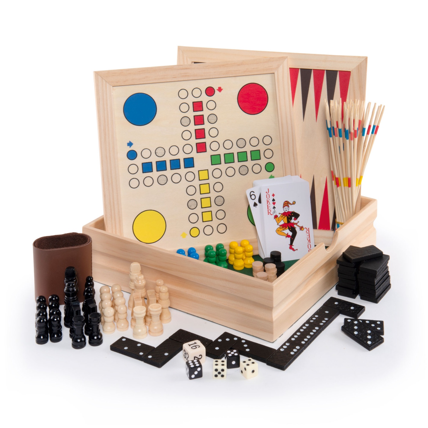 • viele Spiele-Klassiker in einer hochwertigen Holzbox