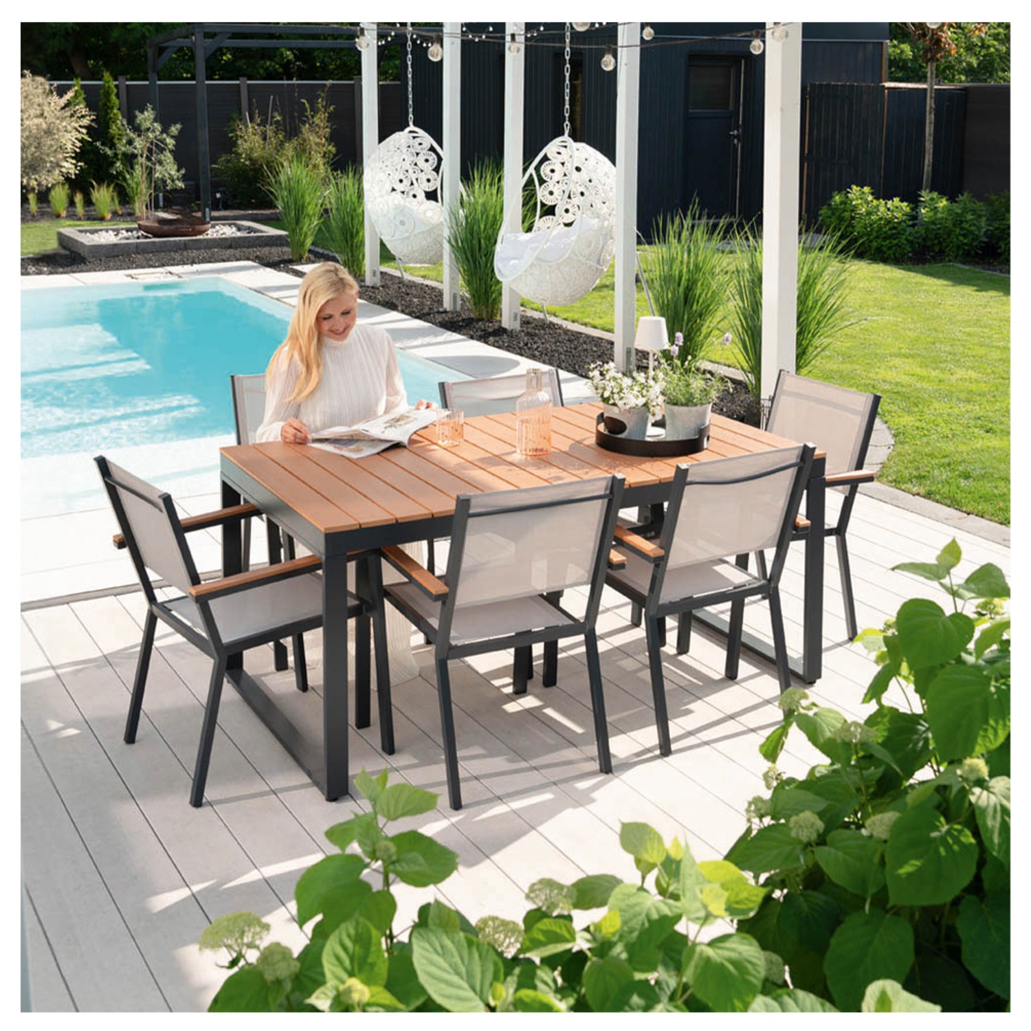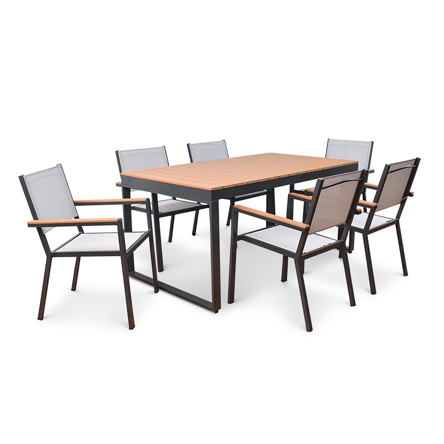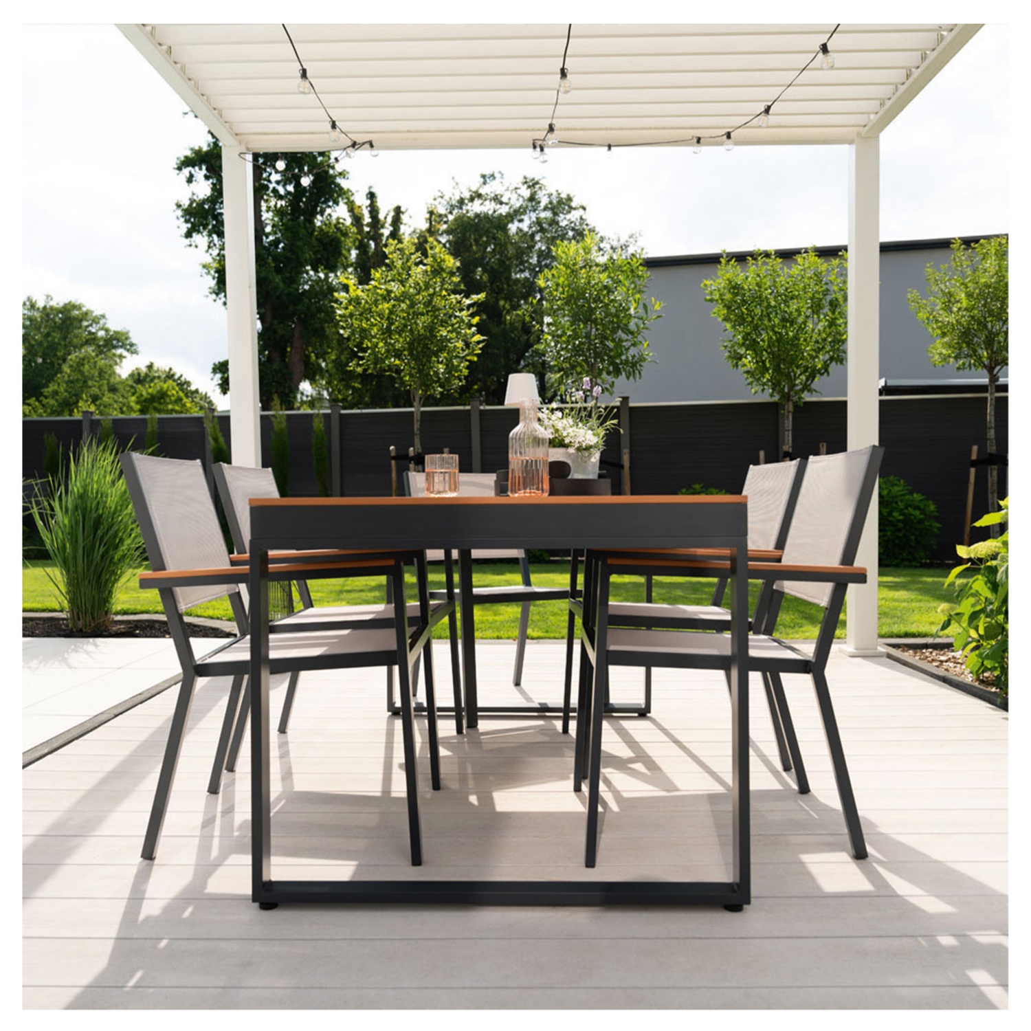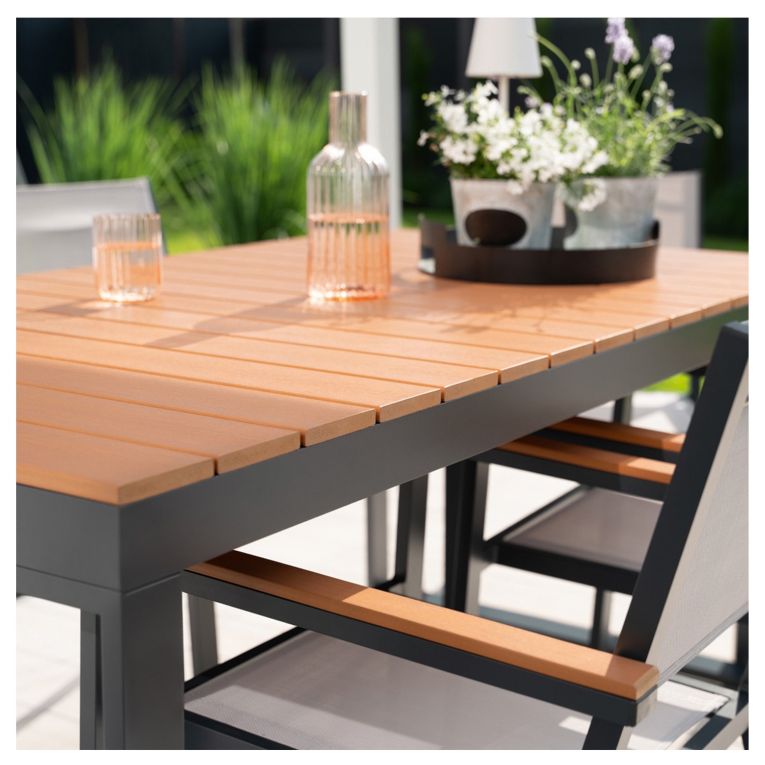Der pulverbeschichtete Aluminiumrahmen bietet eine solide Basis und ist gleichzeitig rostbeständig und langlebig, ideal für den Einsatz im Freien. Die Tischplatte aus Kunststoff in Holzoptik verleiht dem Tisch ein natürliches Aussehen und ist leicht zu reinigen und langlebig. Der Tisch bietet genügend Platz für jede Gelegenheit und eignet sich perfekt für gesellige Runden oder entspannte Mahlzeiten im Freien. Dank seiner Wetter- und UV-Beständigkeit ist er auch bei Sonne und Regen ein zuverlässiger Begleiter.