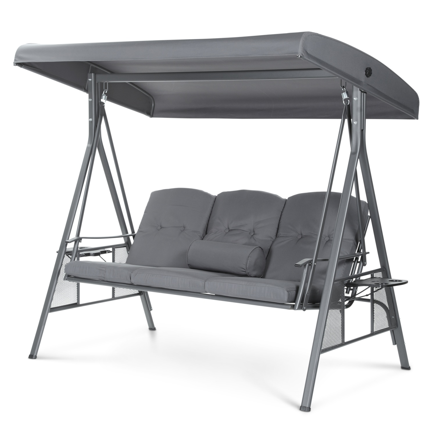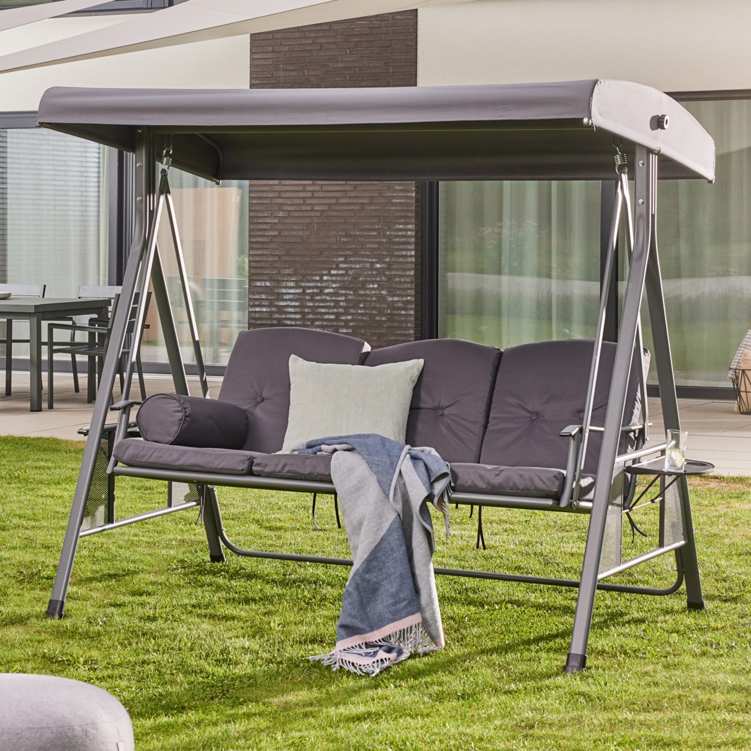 Diese Schaukelbank bietet Platz für bis zu drei Personen und ist ideal für gemütliche Momente auf dem Balkon, der Terrasse oder im Garten. Die hochwertige Verarbeitung aus pulverbeschichtetem Gestell und langlebigem Polyesterdach garantiert optimalen Korrosionsschutz und Schutz vor intensiver Sonneneinstrahlung sowie leichtem Regen. Mit der einstellbaren Vorrichtung bleibt das Sonnendach sicher an Ort und Stelle, selbst bei einem leichten Windstoß. Genieße deine Zeit im Freien mit unseren exklusiven Vorteilen: Die integrierten Getränkehalter bieten Platz für Snacks, Getränke und Bücher, während die weiche 8 cm dicke Polsterung höchsten Sitzkomfort bietet. Das neigungsverstellbare Dach sorgt für UV-beständigen Sonnenschutz, während das pulverbeschichtete Gestell Korrosions - und Witterungsbeständigkeit gewährleistet. Für deine Sicherheit ist ebenfalls gesorgt: Das Vierfußgestell gewährleistet Stabilität, während die Anti-Rutsch-Fußpads zusätzliche Sicherheit bieten.