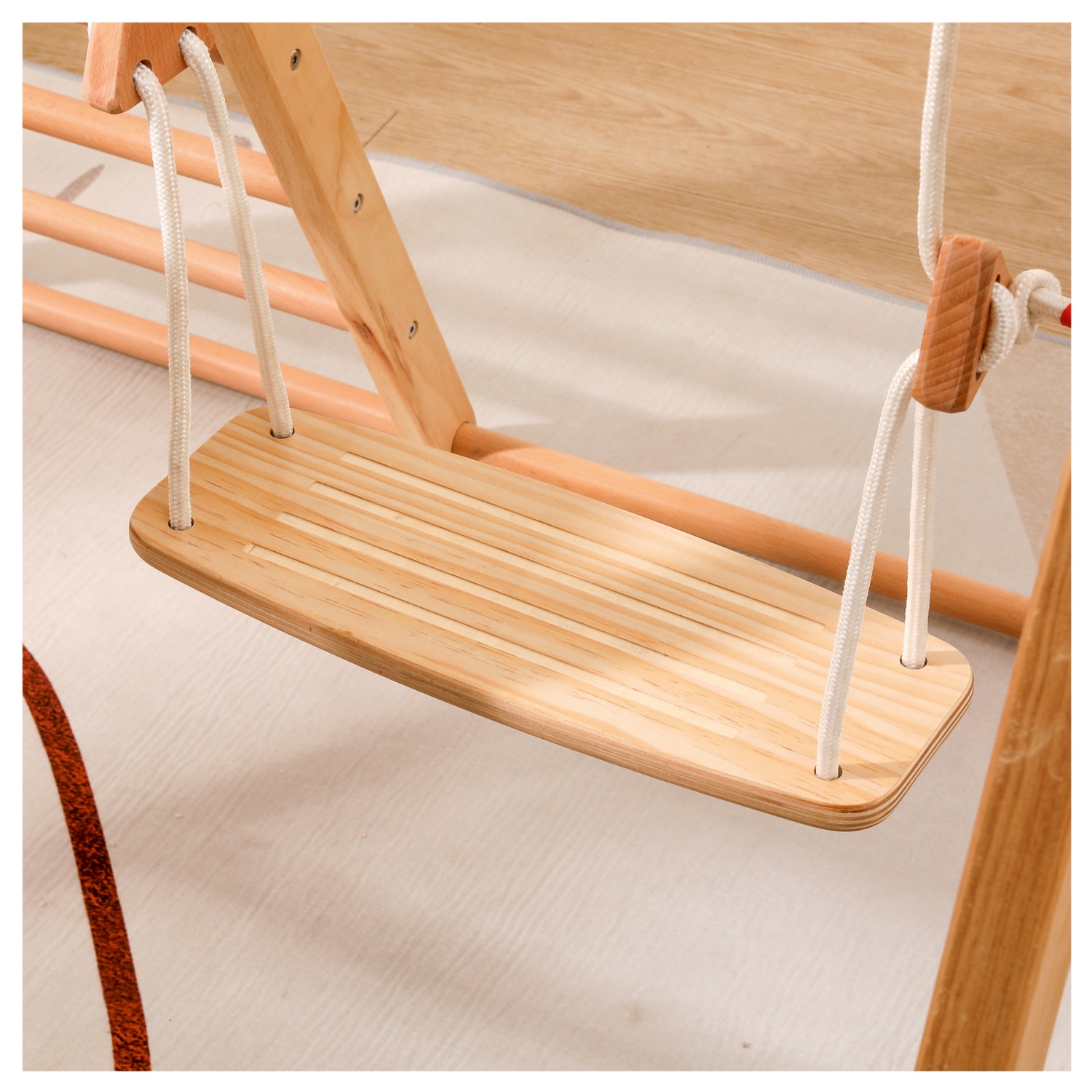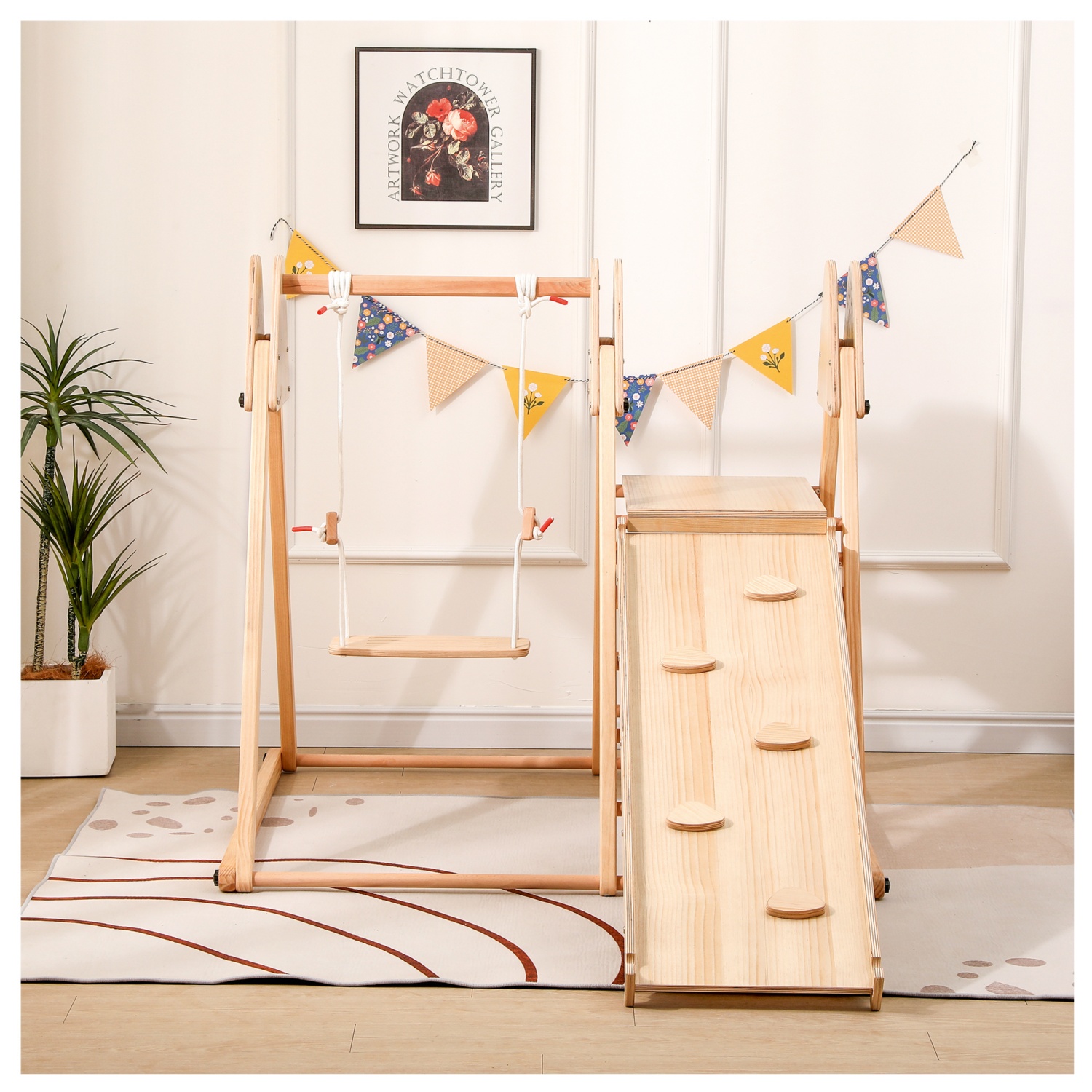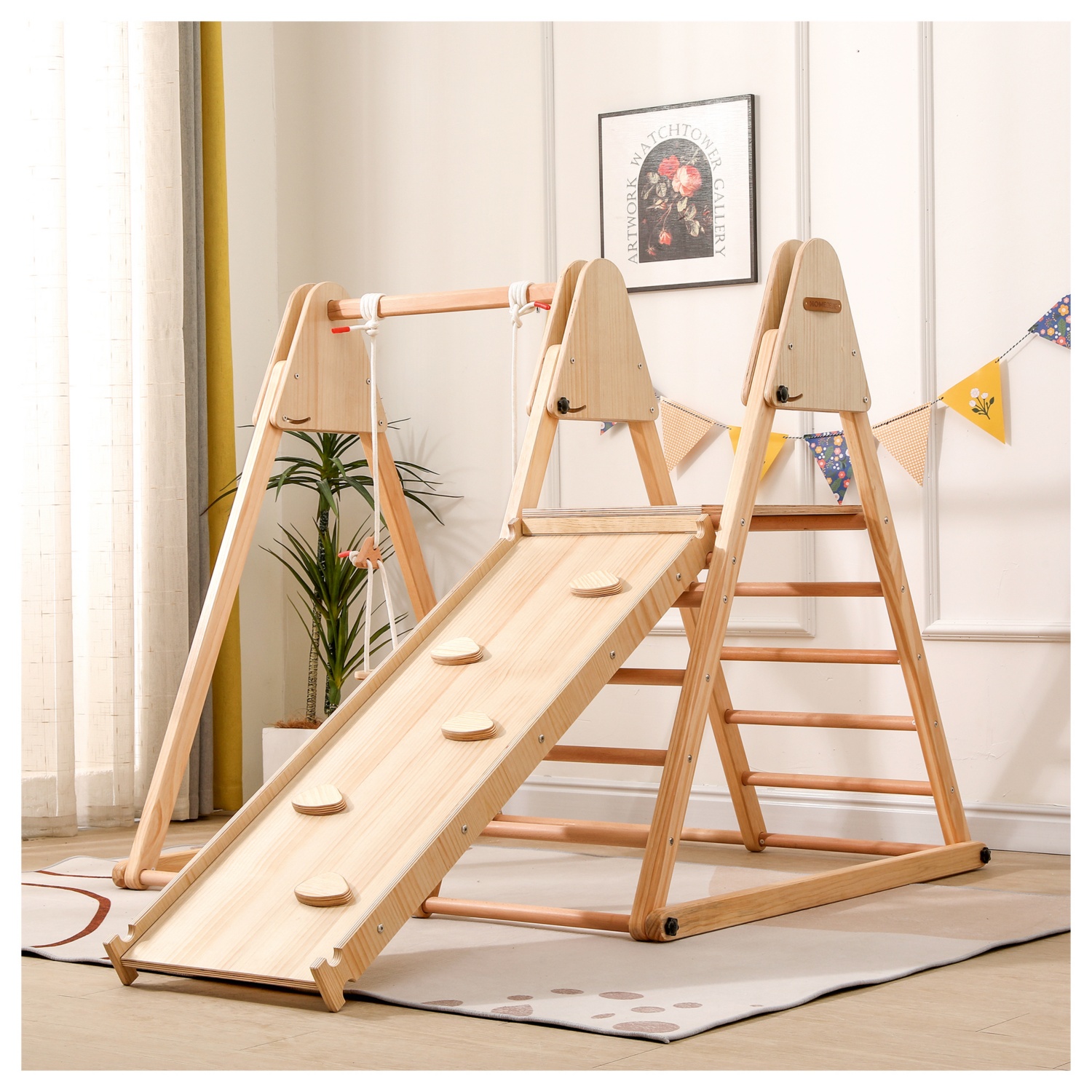Mit Rutsche und Schaukel bietet es endlose Spielmöglichkeiten und fügt sich mit seiner natürlichen Farbe harmonisch in jedes Raumkonzept ein. Die einfache Montage sorgt dafür, dass der Spaß sofort beginnen kann!